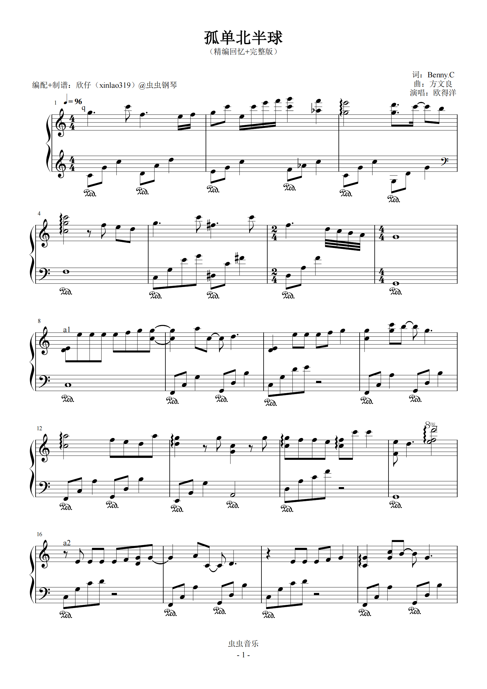 钢琴谱:孤单北半球(C、欧得洋、精编回忆+完整版)