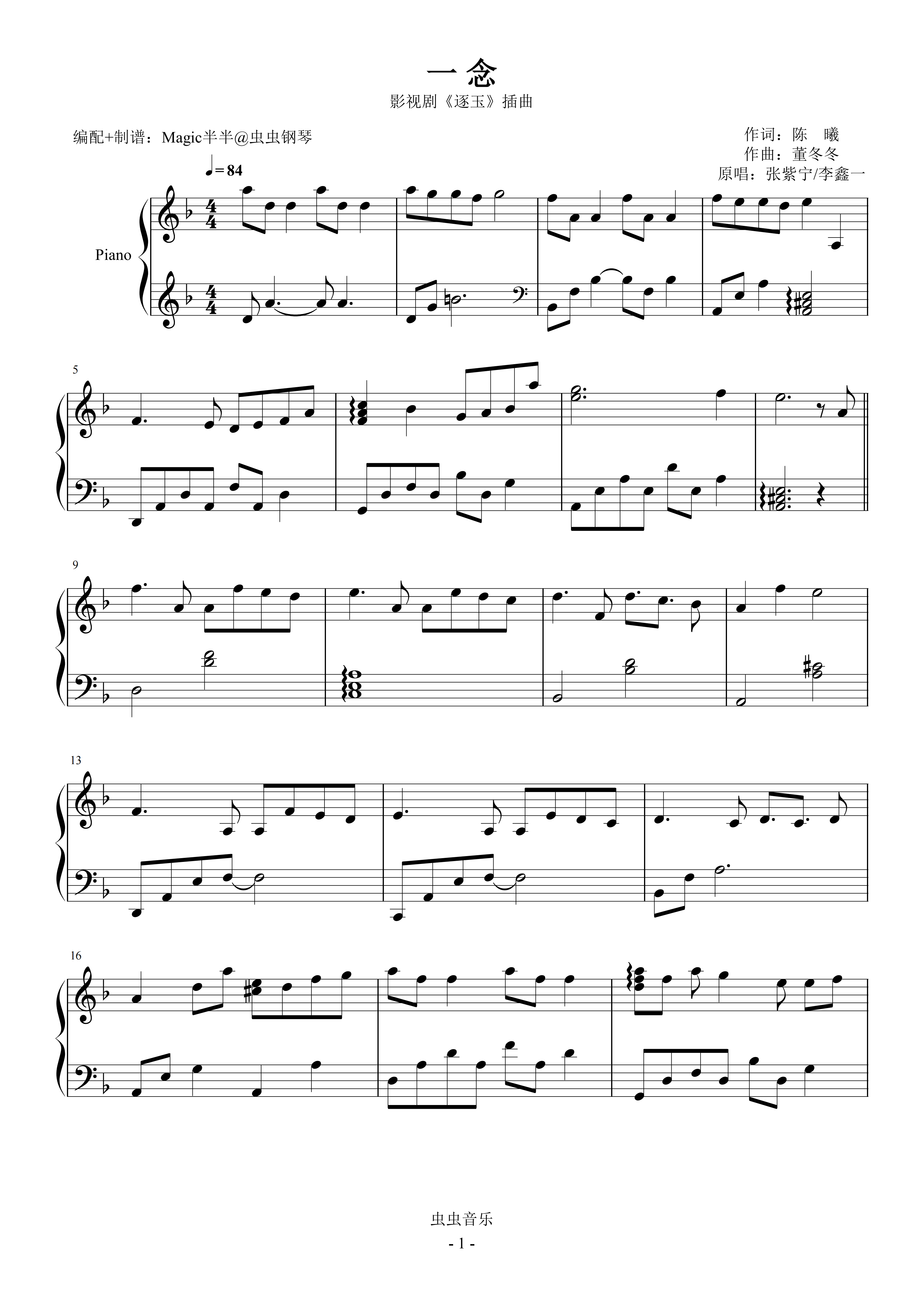 钢琴谱:一念(实用完整版/独奏F) <逐玉>影视剧插曲