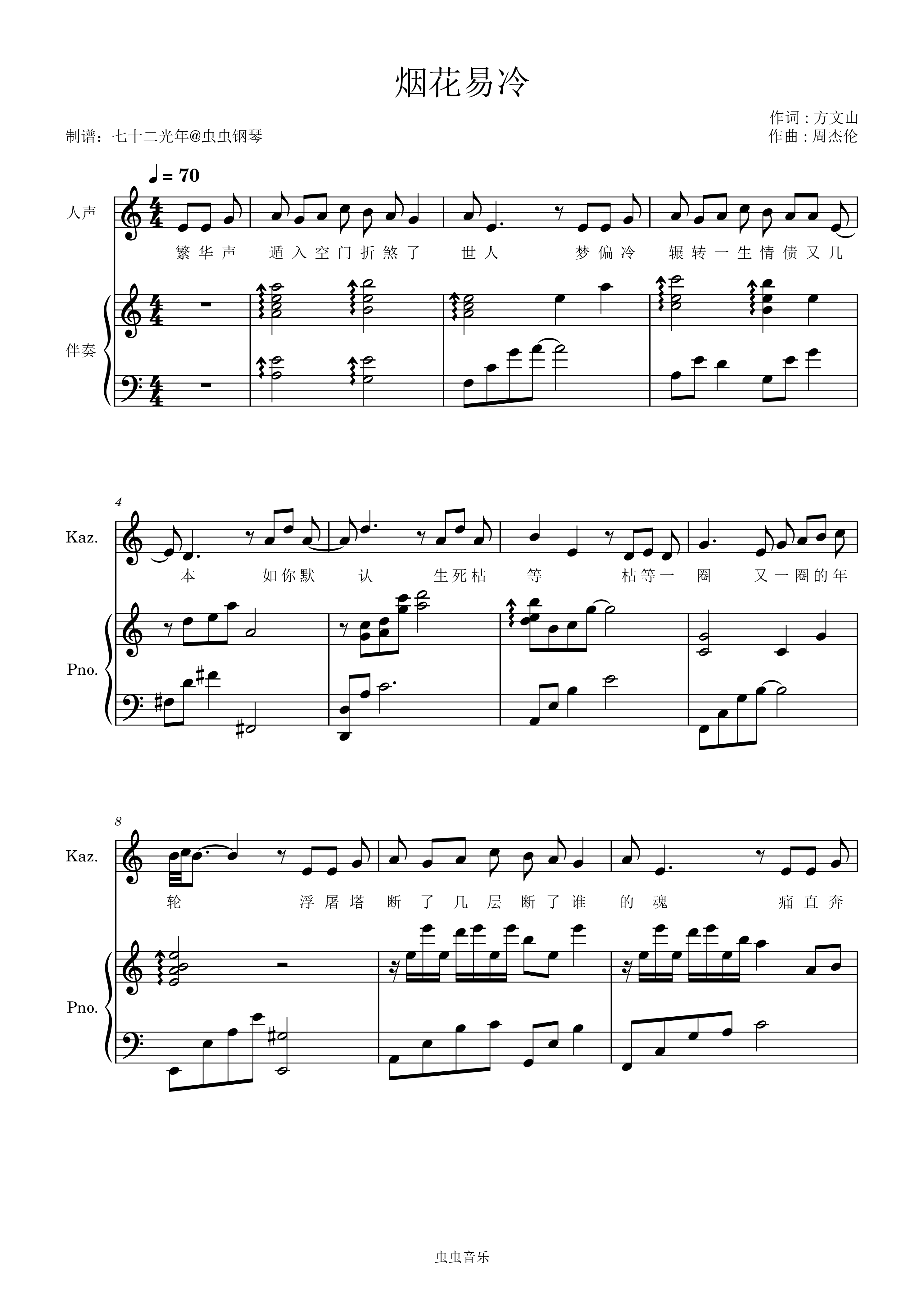 • 烟花易冷钢琴简谱 C调 数字双手 方文山