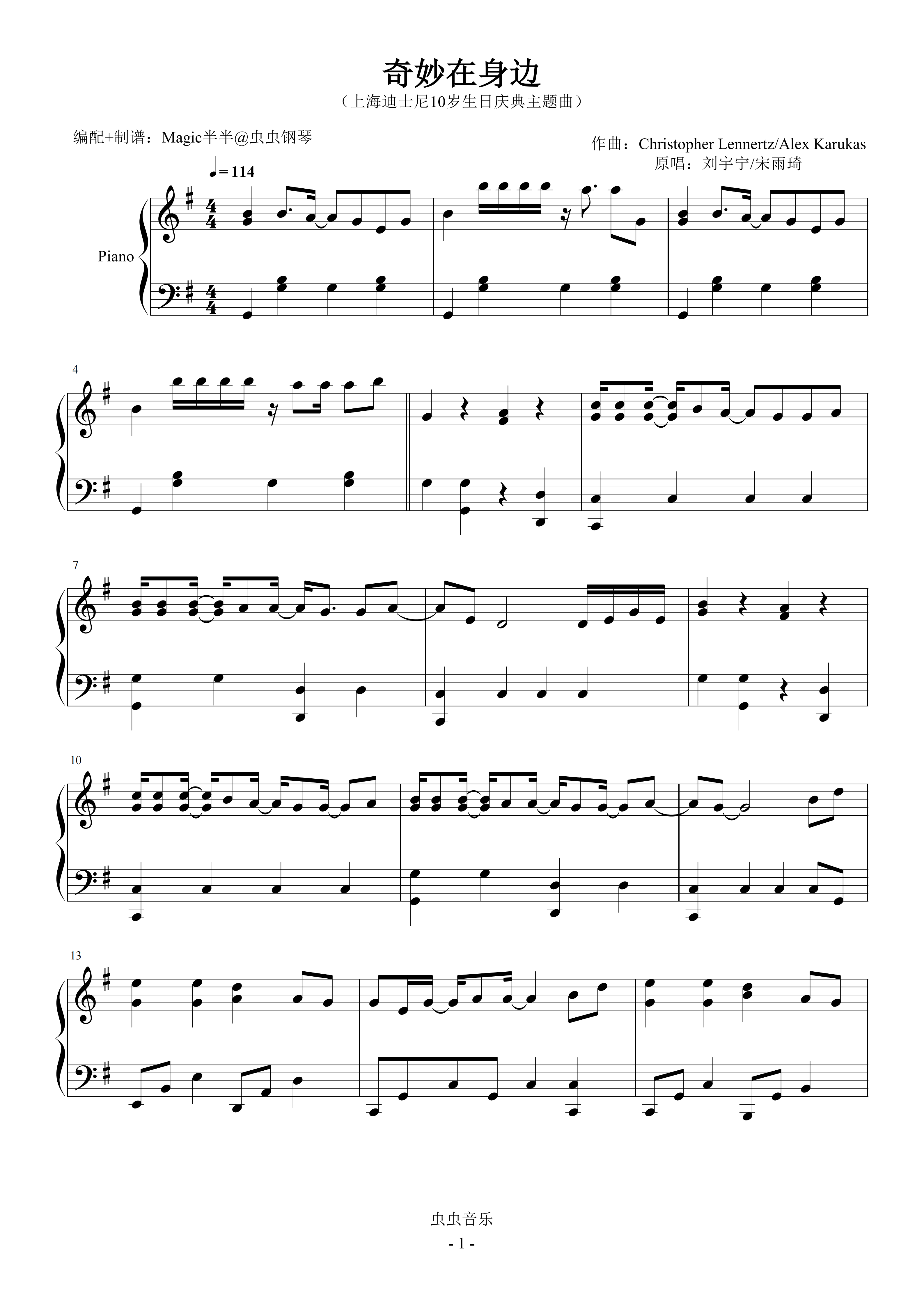 钢琴谱:奇妙在身边(实用/完整版/G) 上海迪士尼10岁生日庆典主题曲