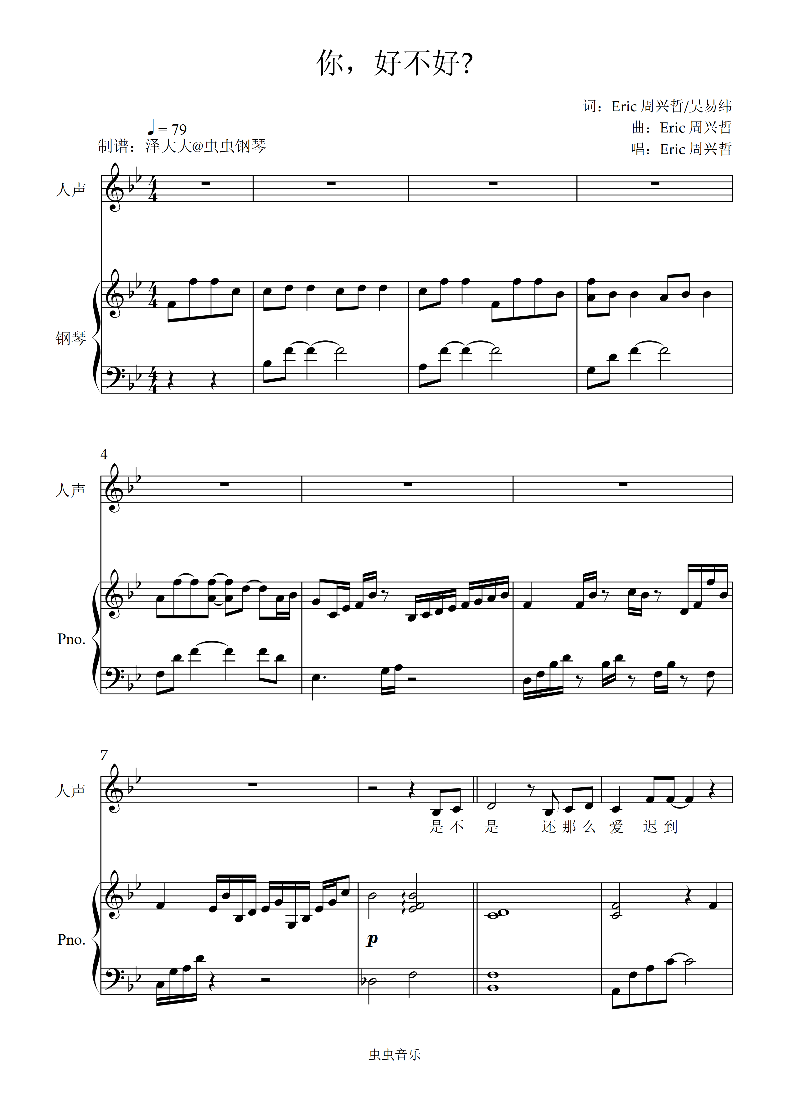 • 你,好不好?钢琴简谱 Bb调 数字双手 周兴哲/吴易纬