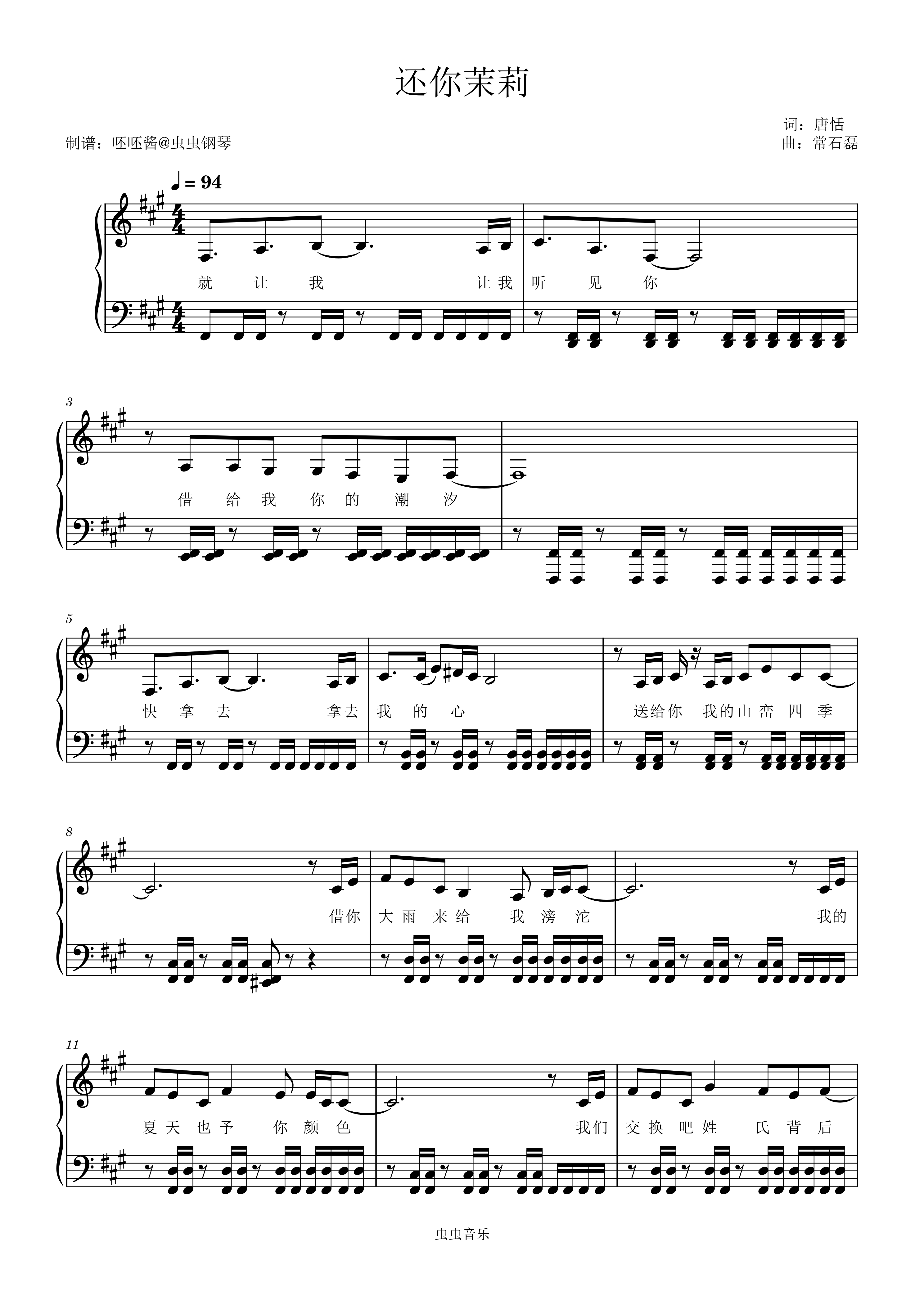 钢琴谱:还你茉莉【男生版】-单依纯-A调