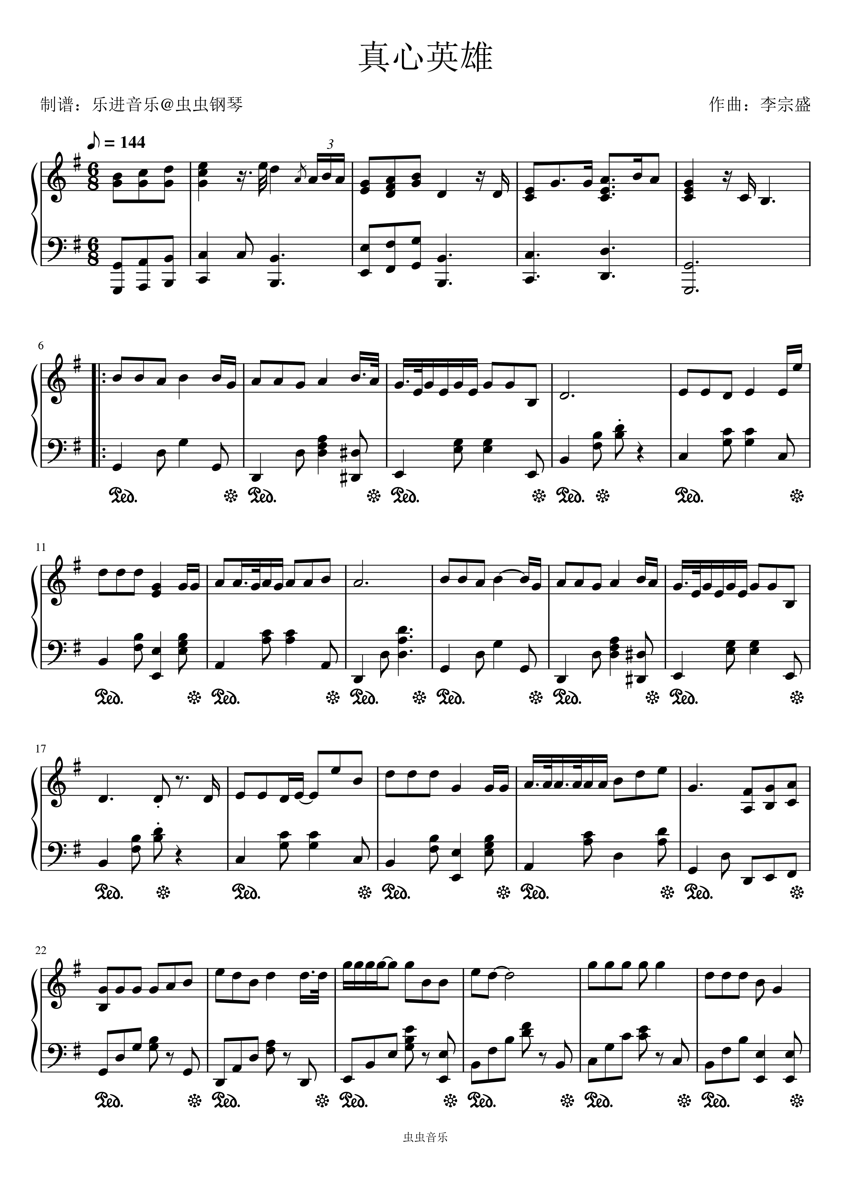 • 真心英雄钢琴简谱 G调 数字双手 李宗盛