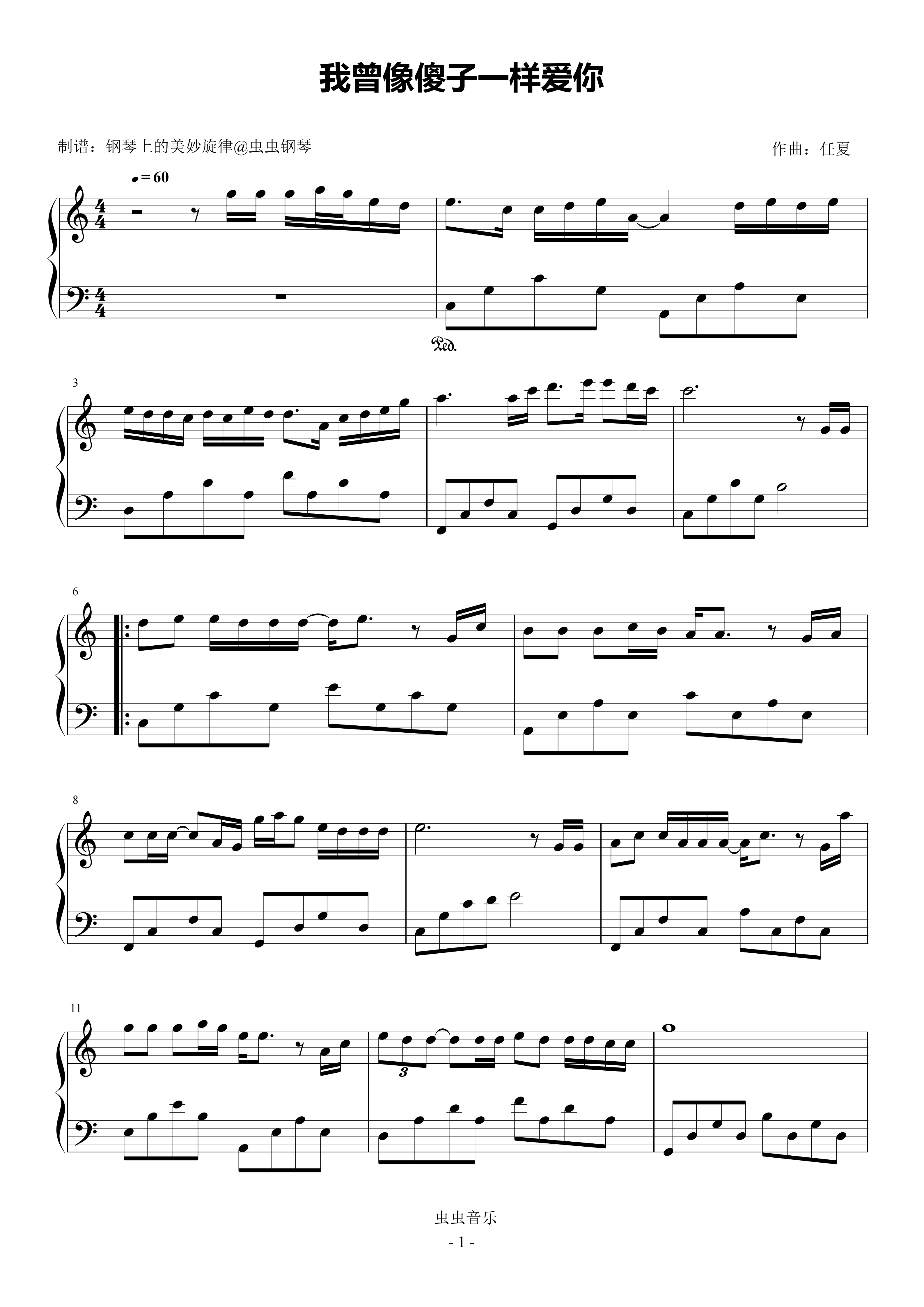 钢琴谱:我曾像傻子一样爱你 C调简易版 任夏