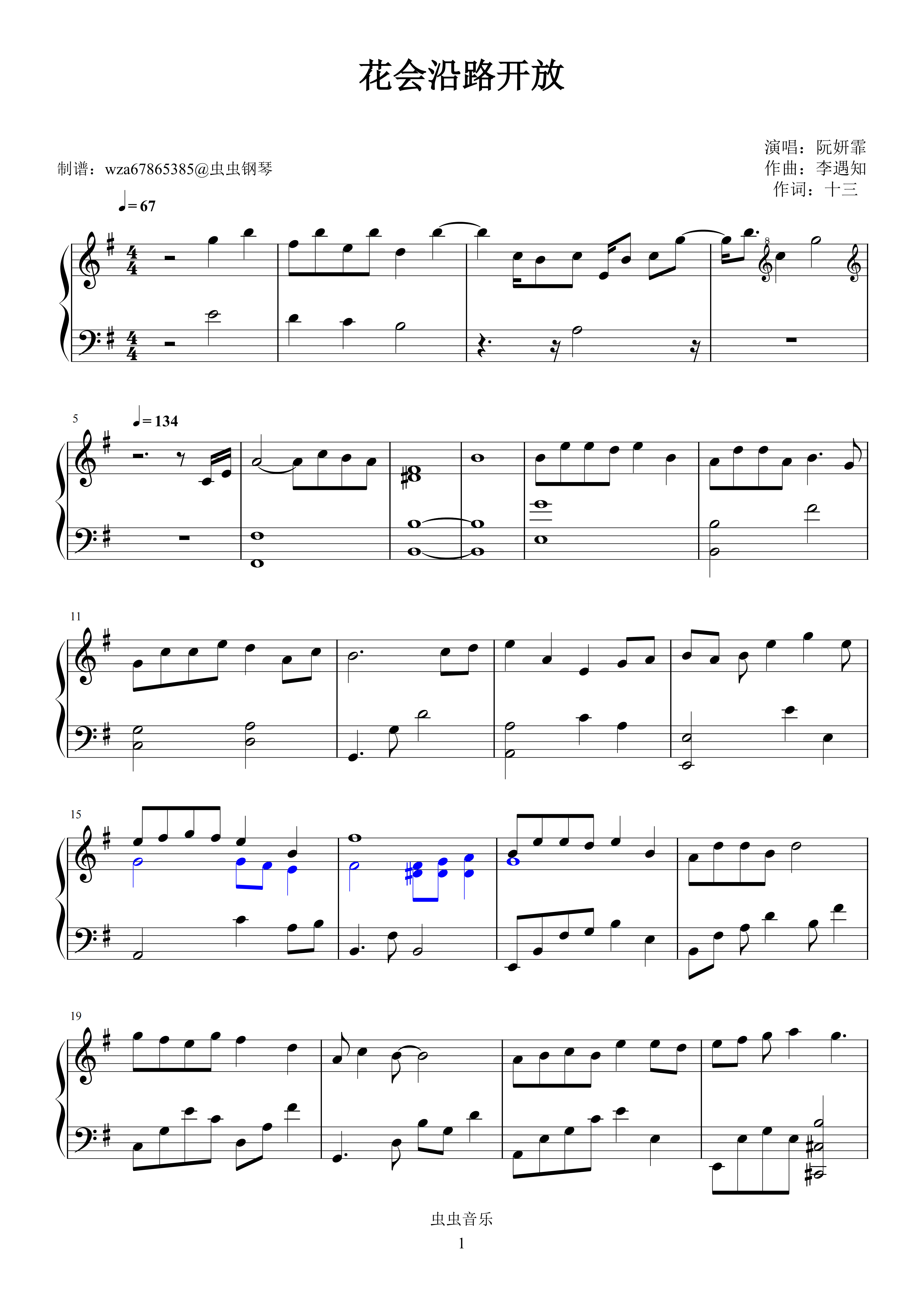 钢琴谱:花会沿路开放