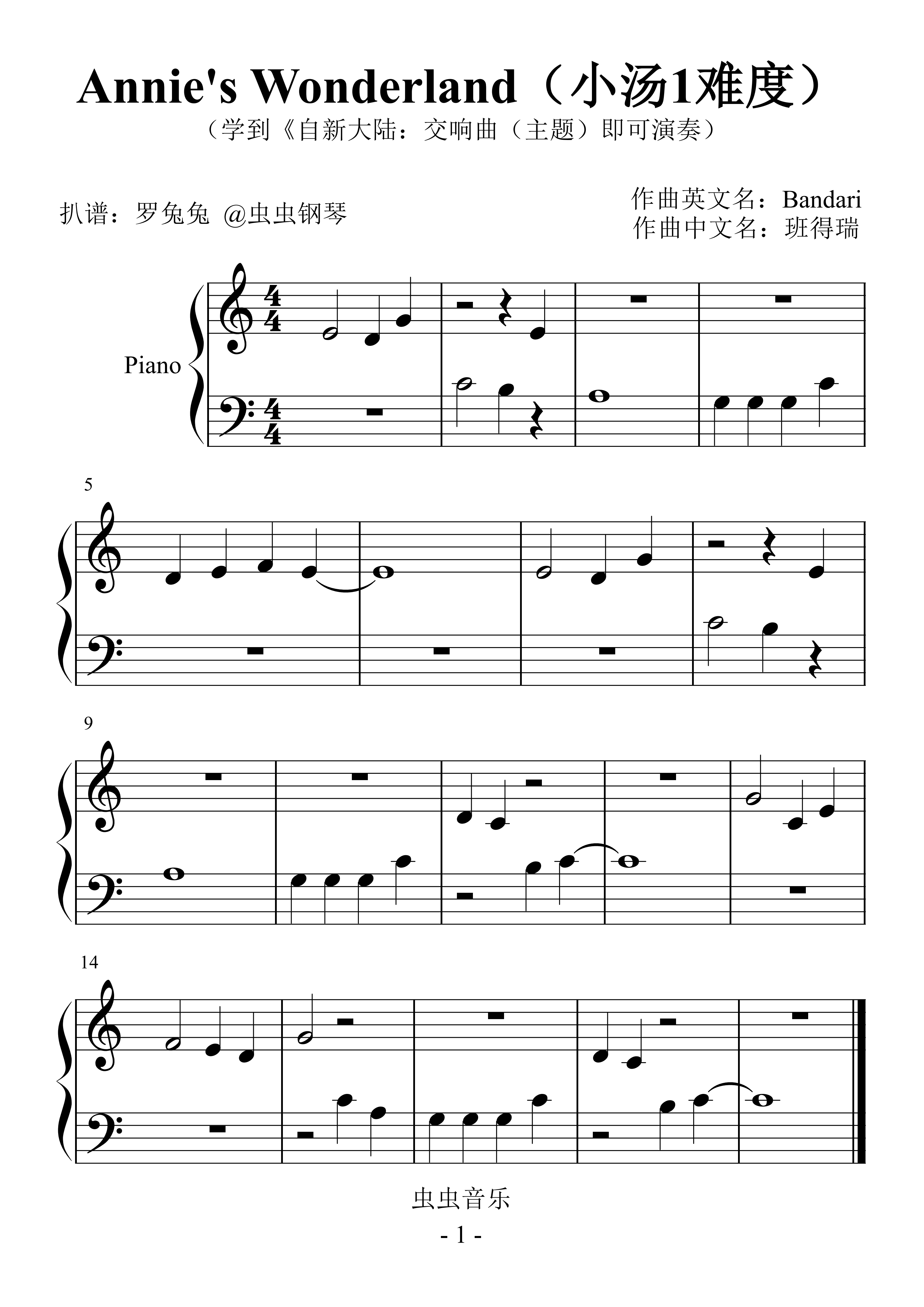 钢琴谱:Annie's Wonderland(小汤1难度)