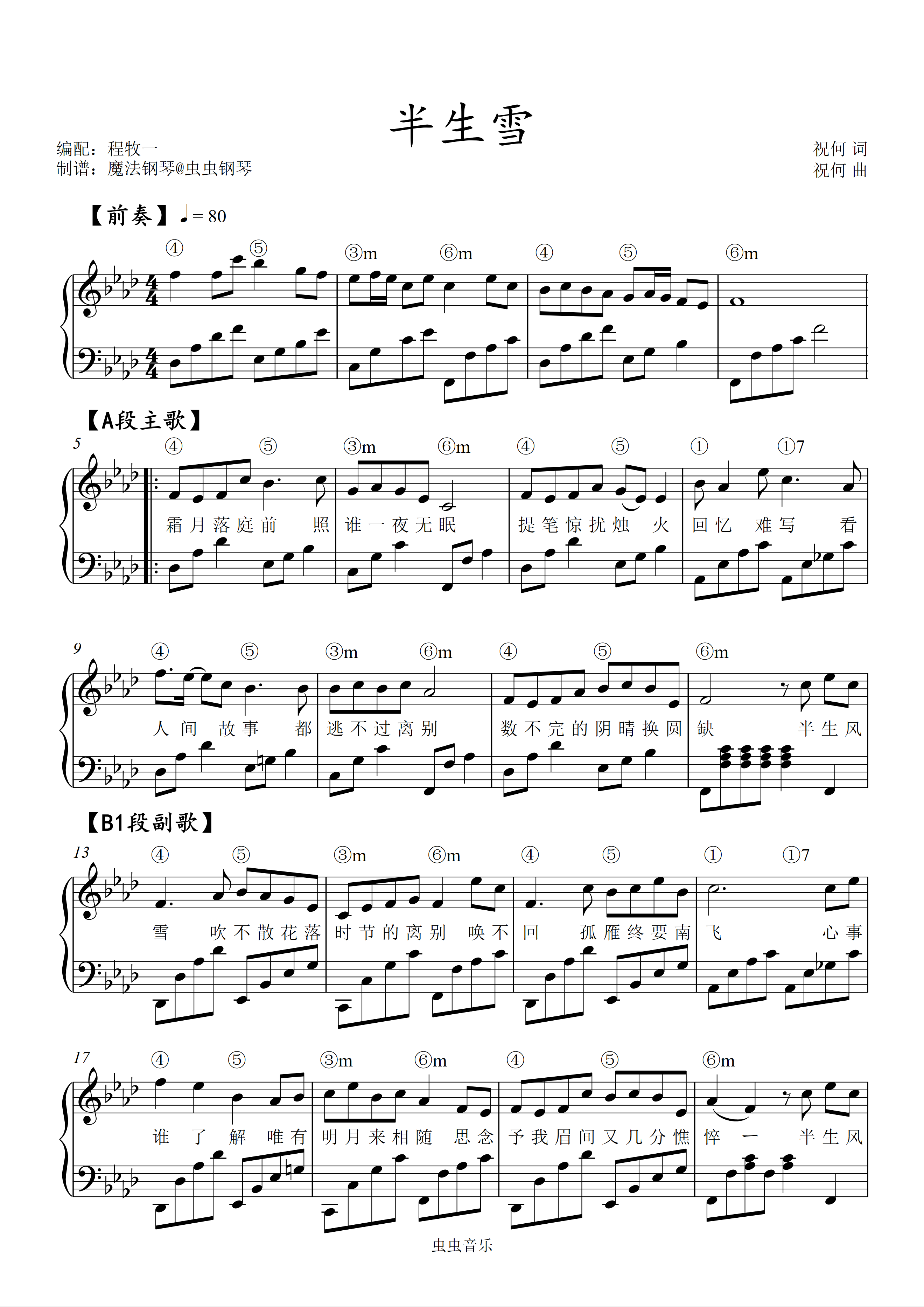 • 半生雪钢琴简谱 Ab调 数字双手 祝何