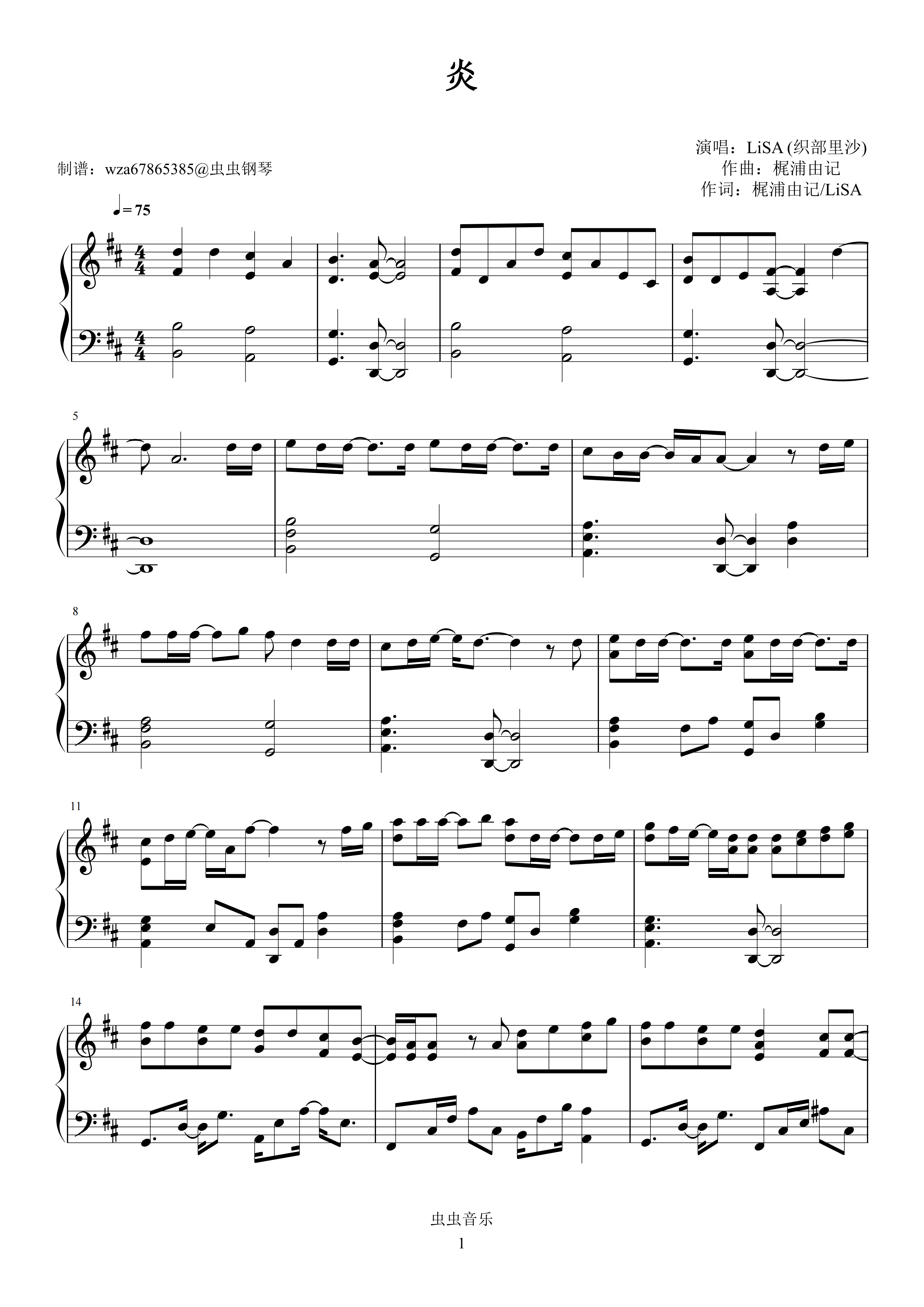 • 炎钢琴简谱 D调 数字双手 梶浦由記/LiSA