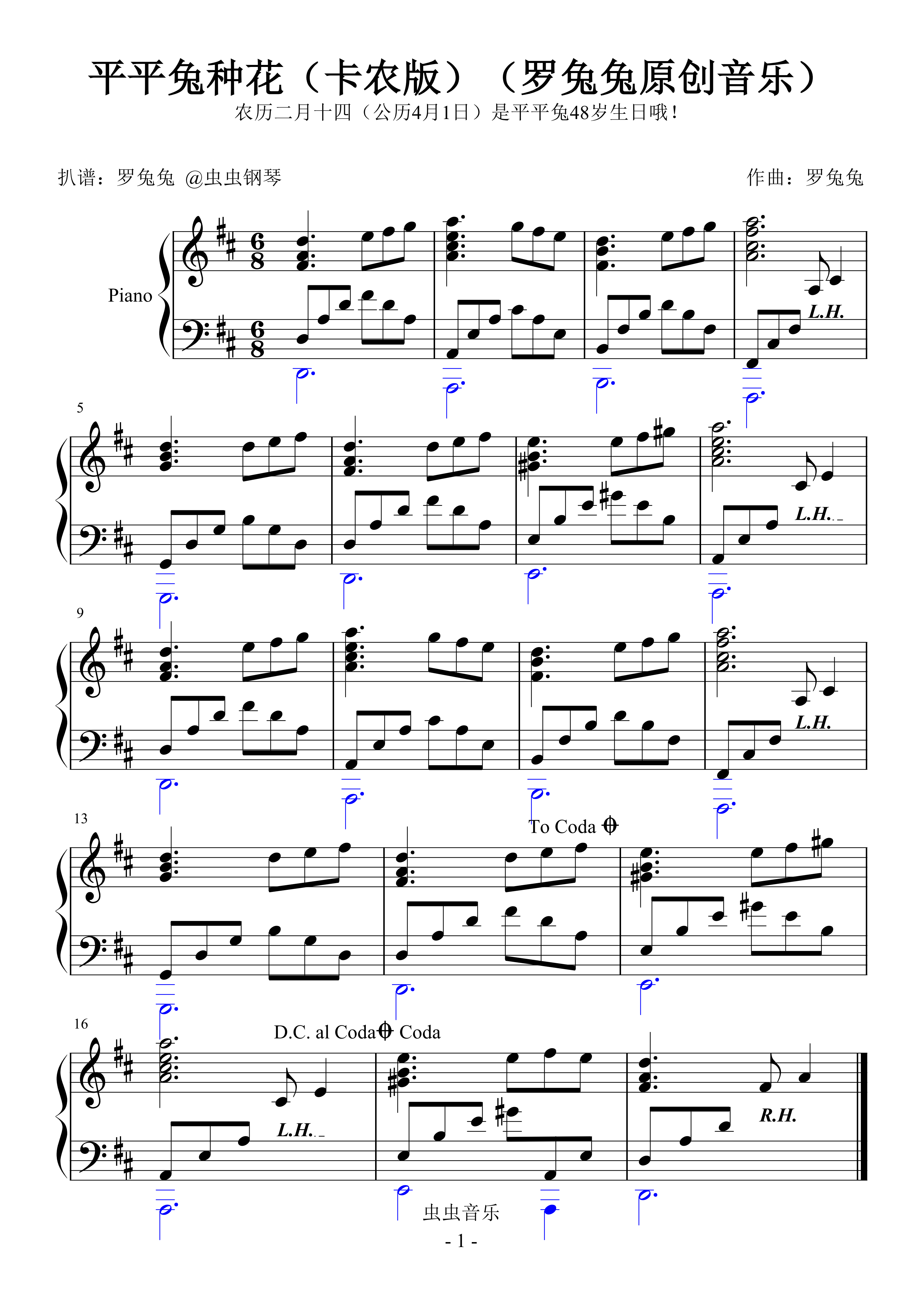 钢琴谱:平平兔种花(卡农版)(罗兔兔原创音乐)(祝平平兔48岁生日快乐!)