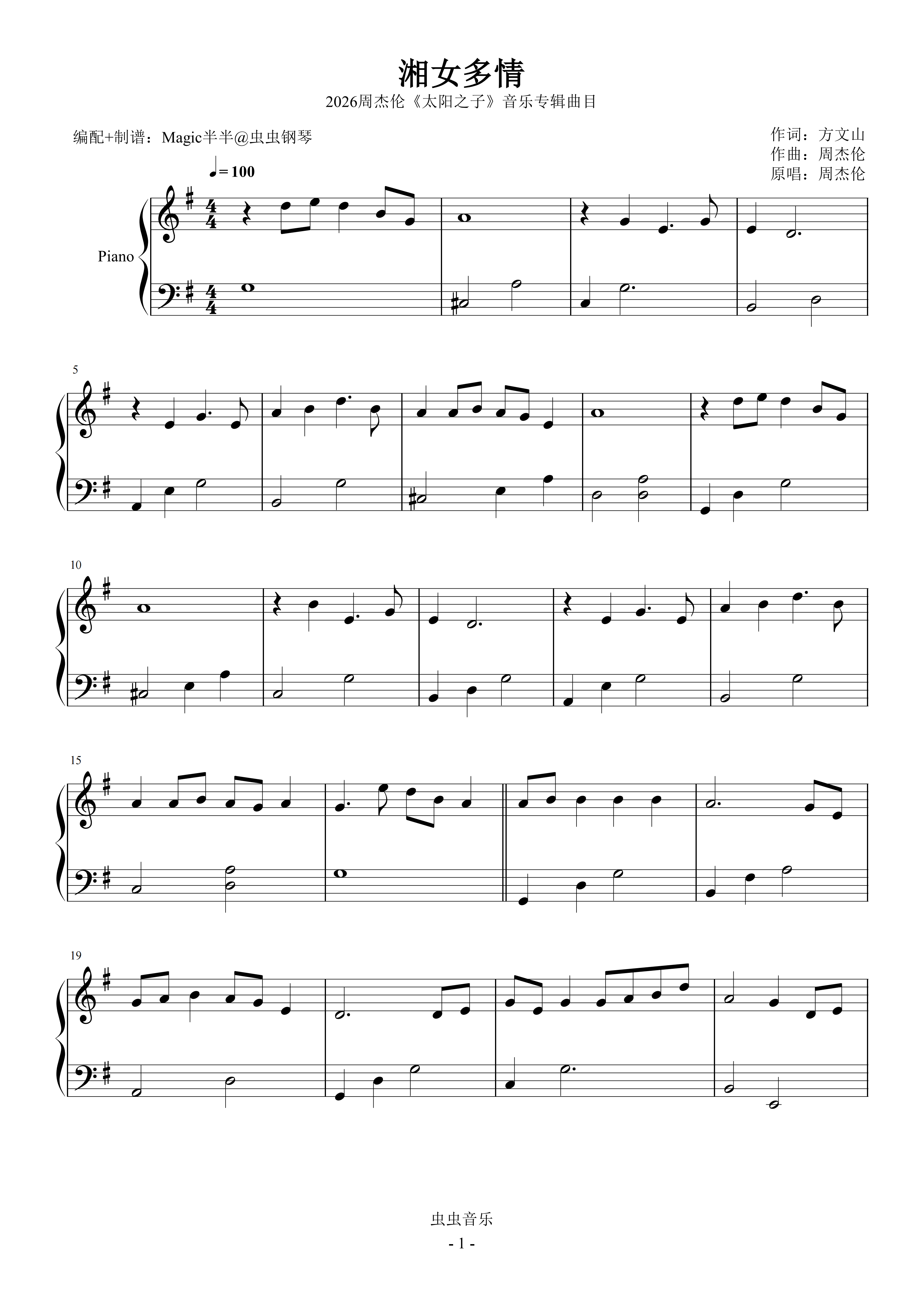 钢琴谱:湘女多情(适幼/柔钢版/G调) 周杰伦<太阳之子>专辑曲目