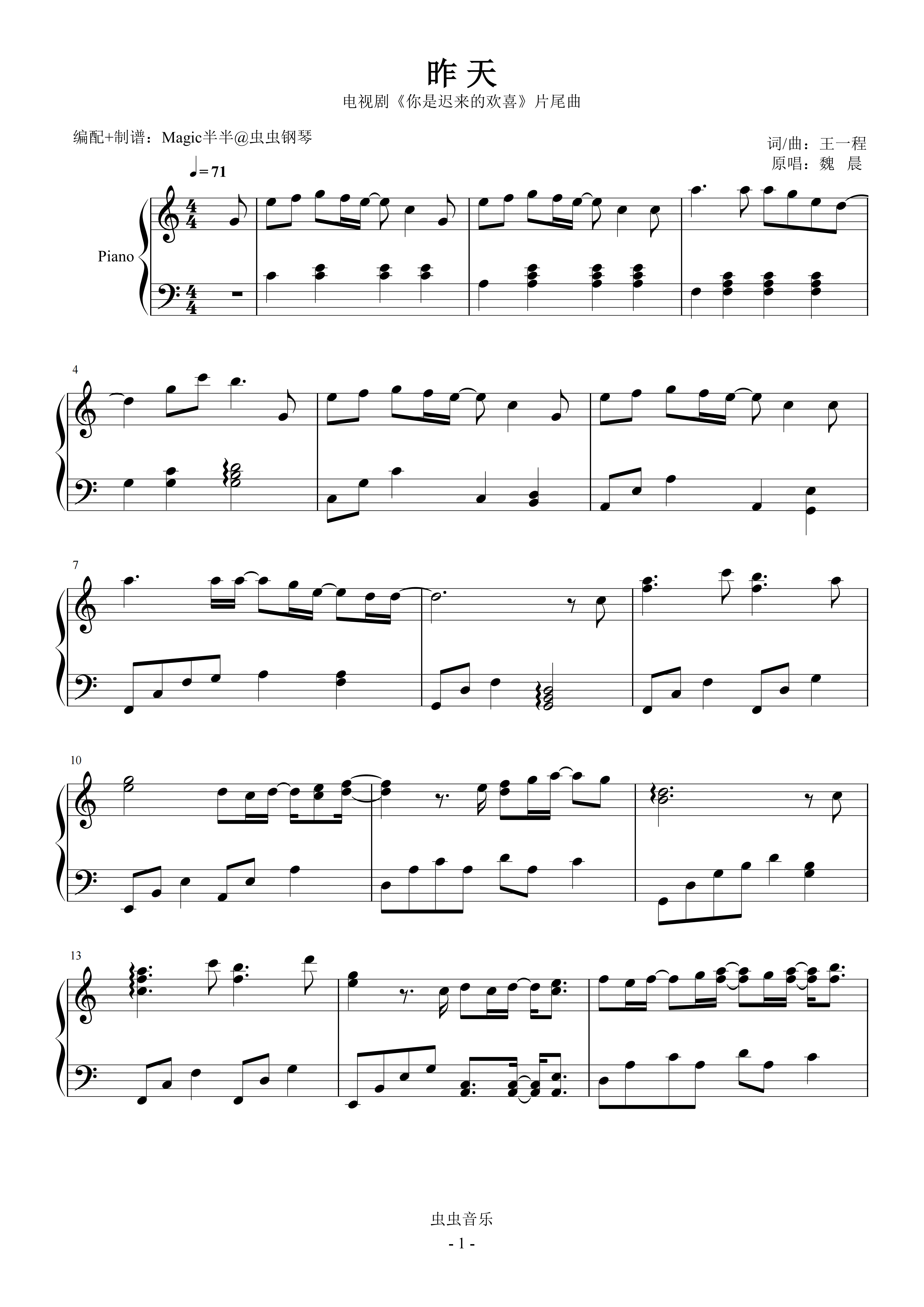 钢琴谱:昨天(实用精华版/C调) <你是迟来的欢喜>电视剧片尾曲