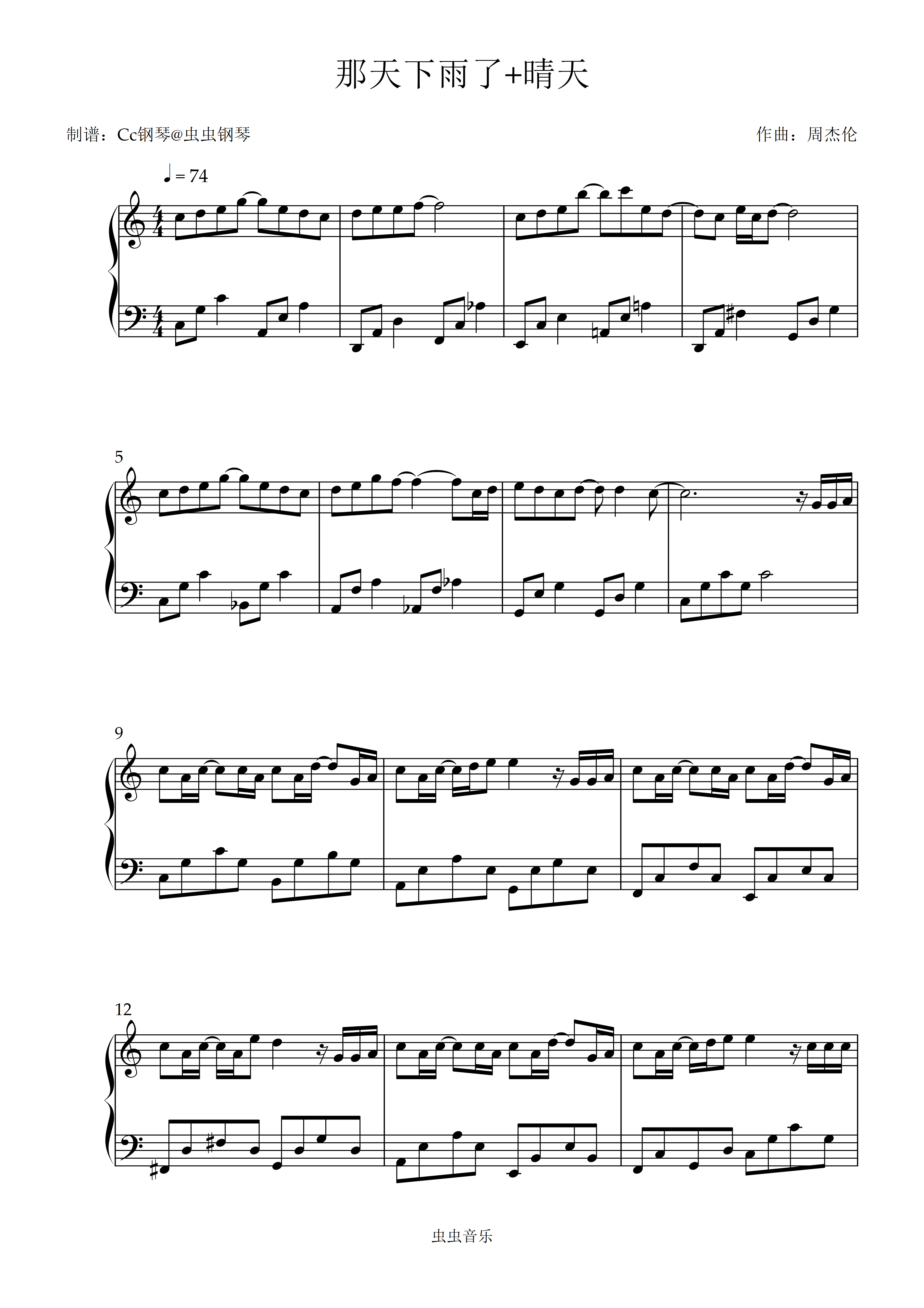 钢琴谱:那天下雨了+晴天 C调 好听易上手