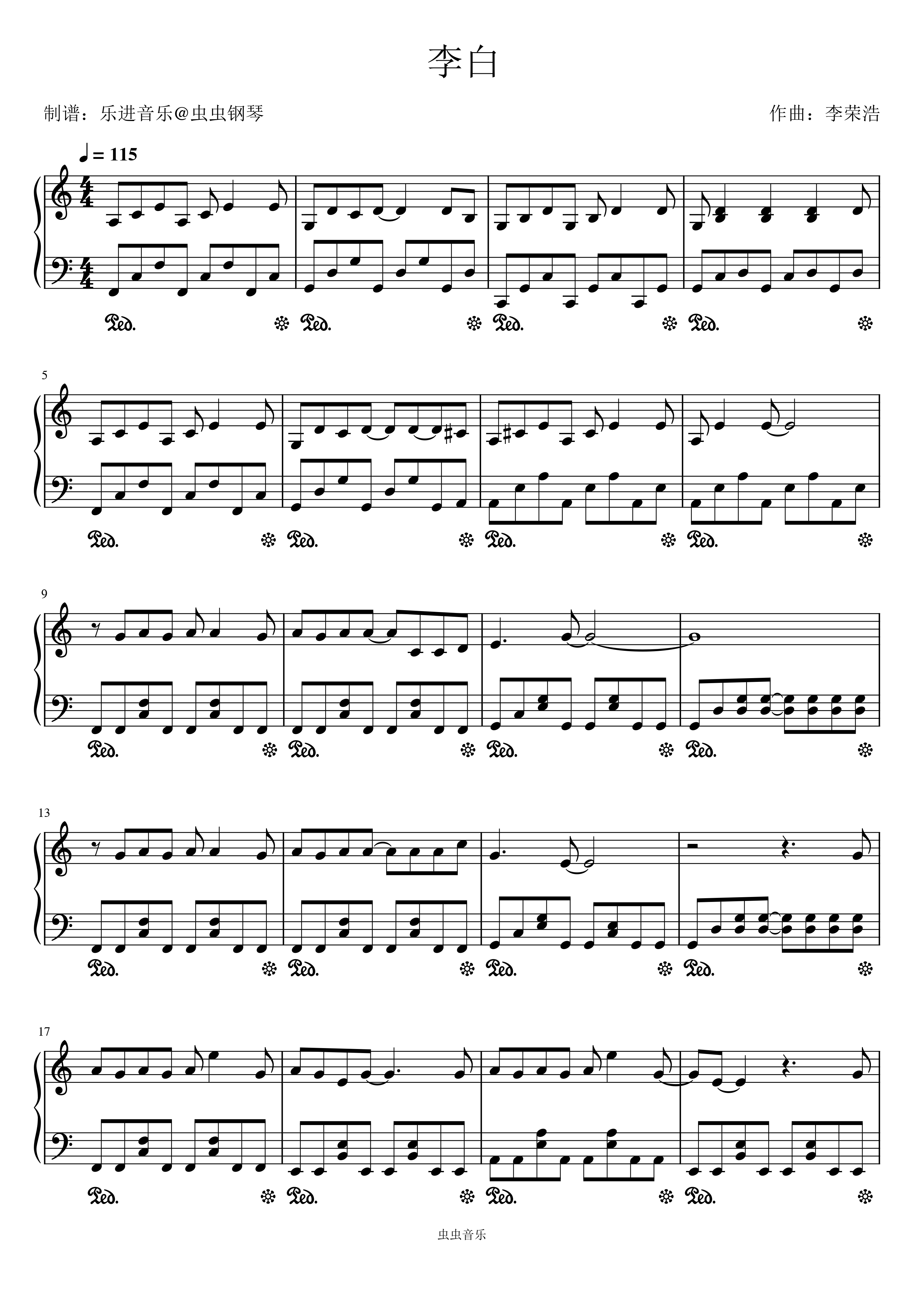 钢琴谱:《李白》李荣浩C调
