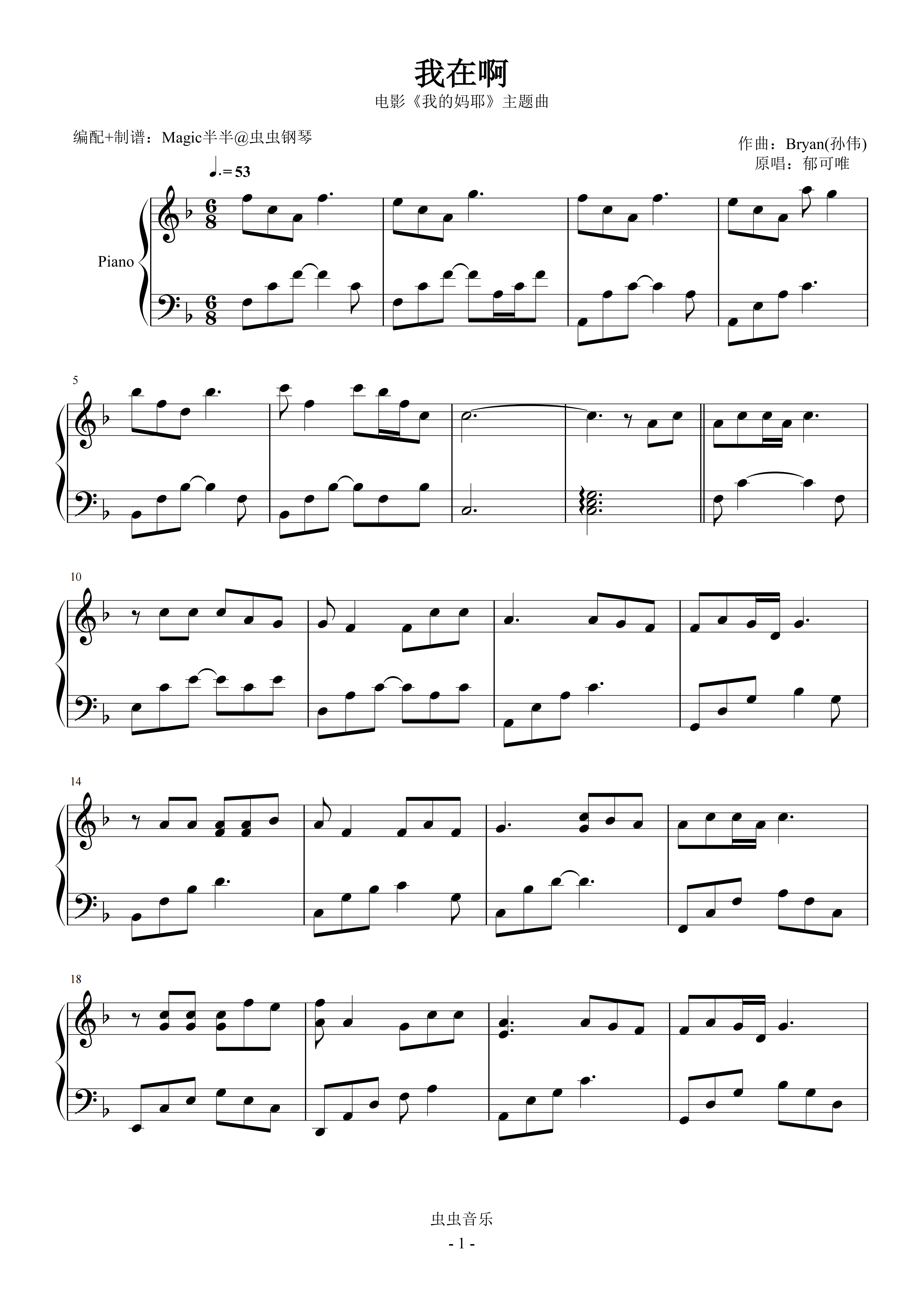钢琴谱:我在啊(实用完整版/F调) <我的妈耶>电影主题曲
