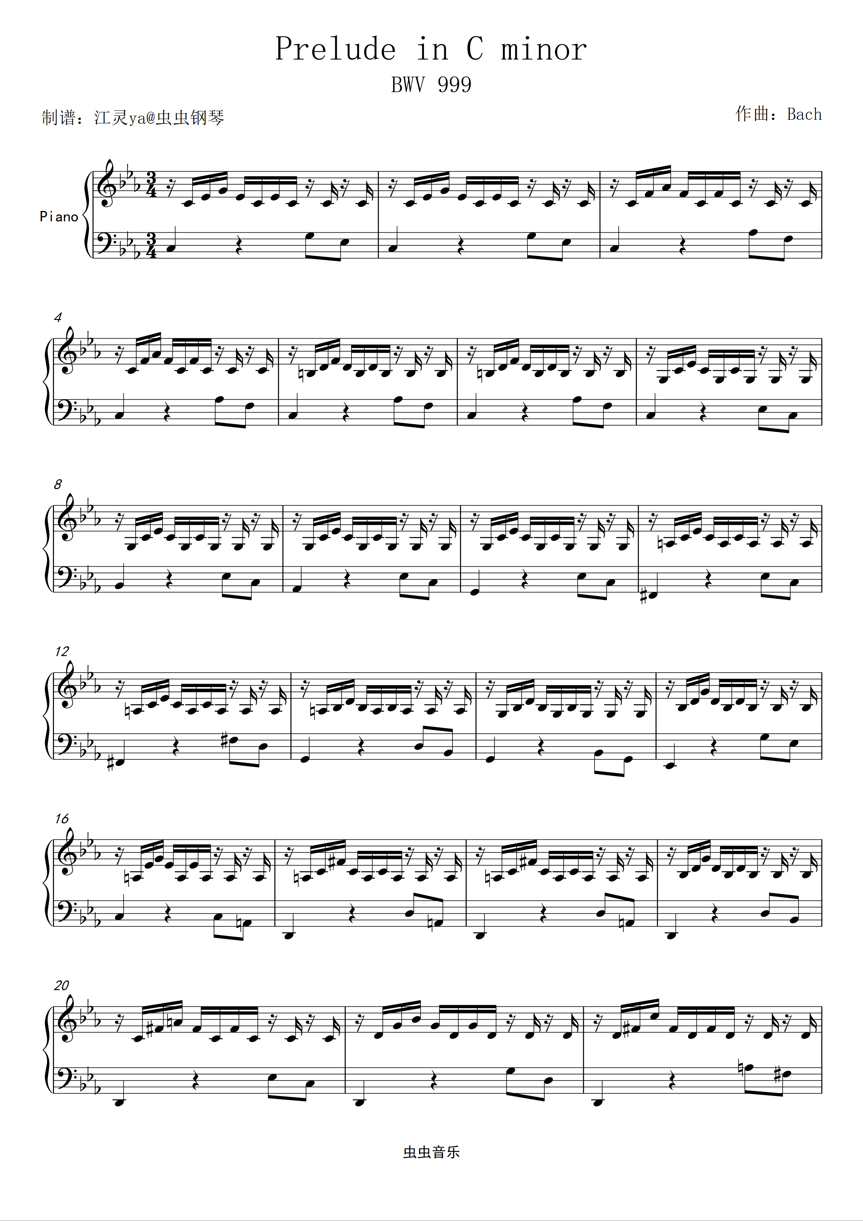 • 1. C小调前奏曲 BWV 999 约·塞·巴赫钢琴简谱 C调 数字双手