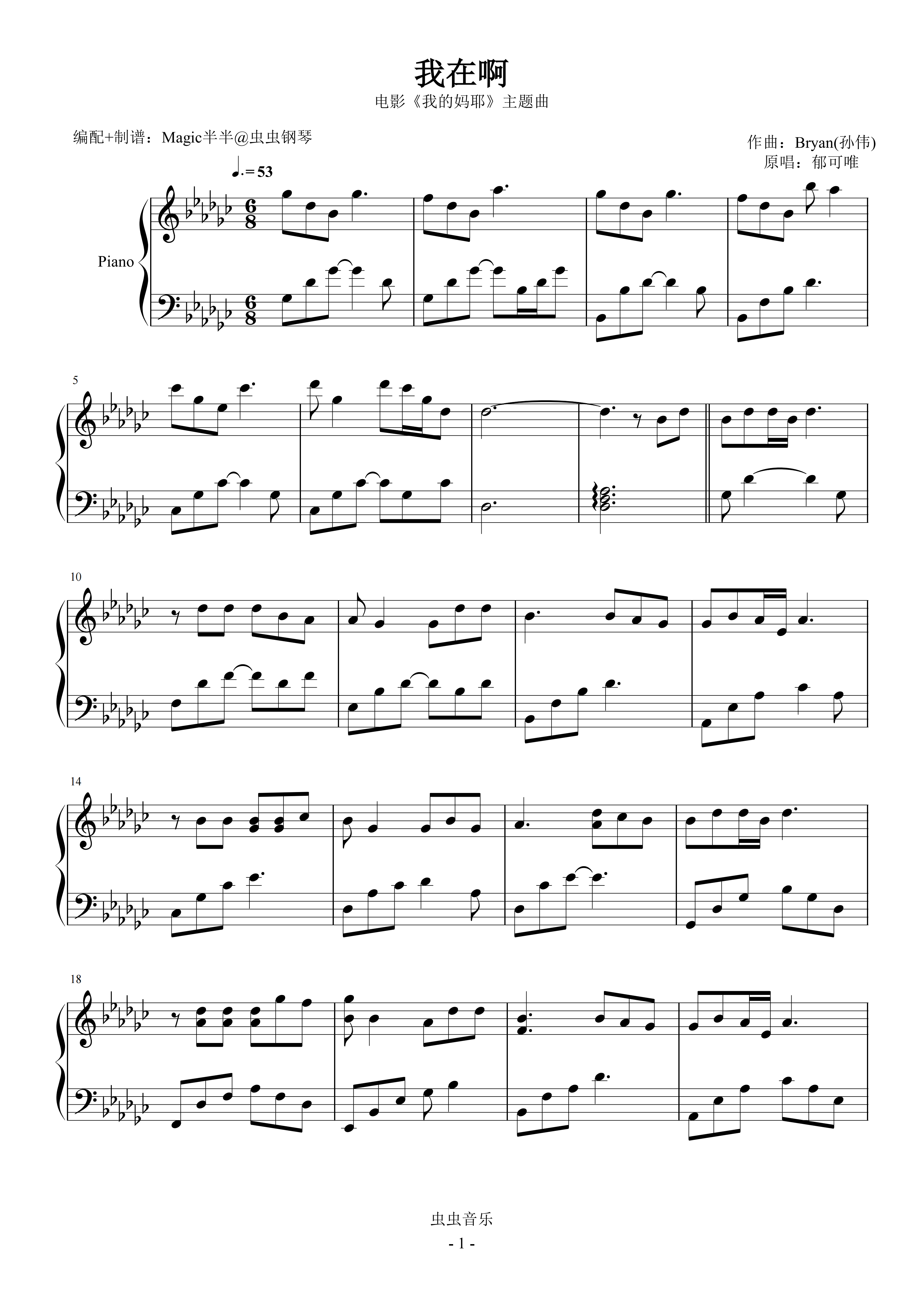 钢琴谱:我在啊(实用完整版/降G) <我的妈耶>电影主题曲