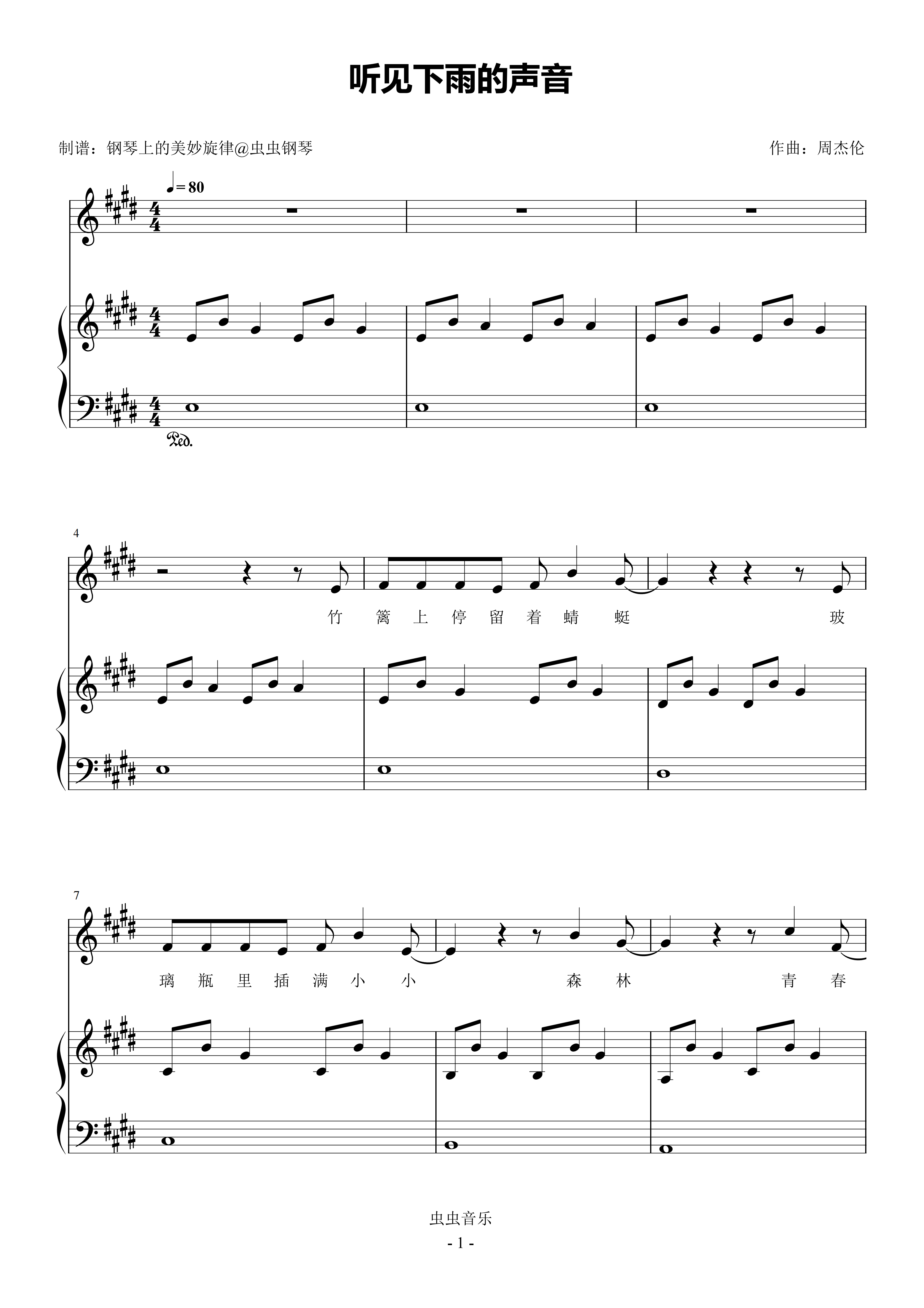 • 听见下雨的声音钢琴简谱 E调 数字双手 方文山