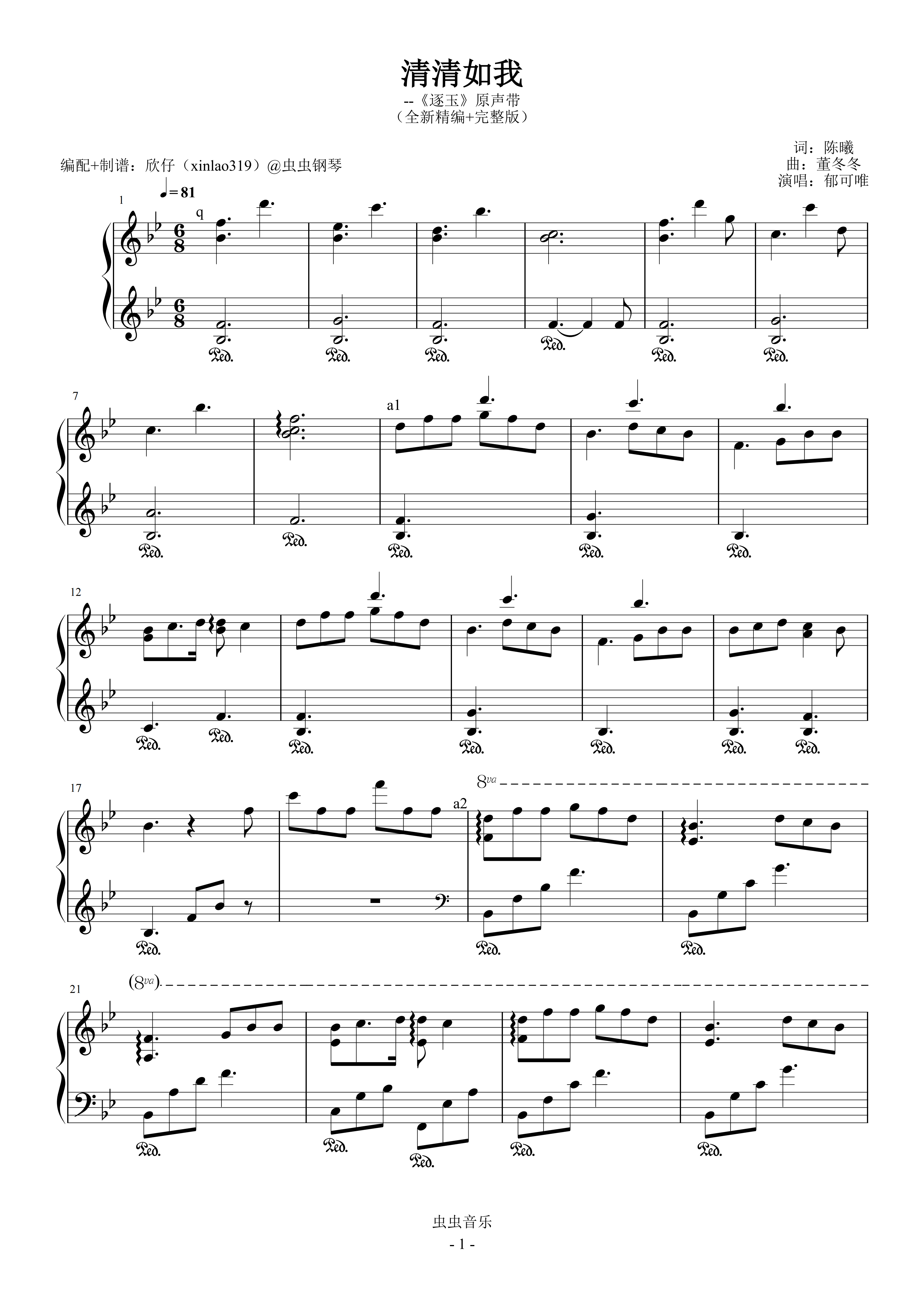 钢琴谱:清清如我(原调降B、郁可唯《逐玉》原声带、完整版)