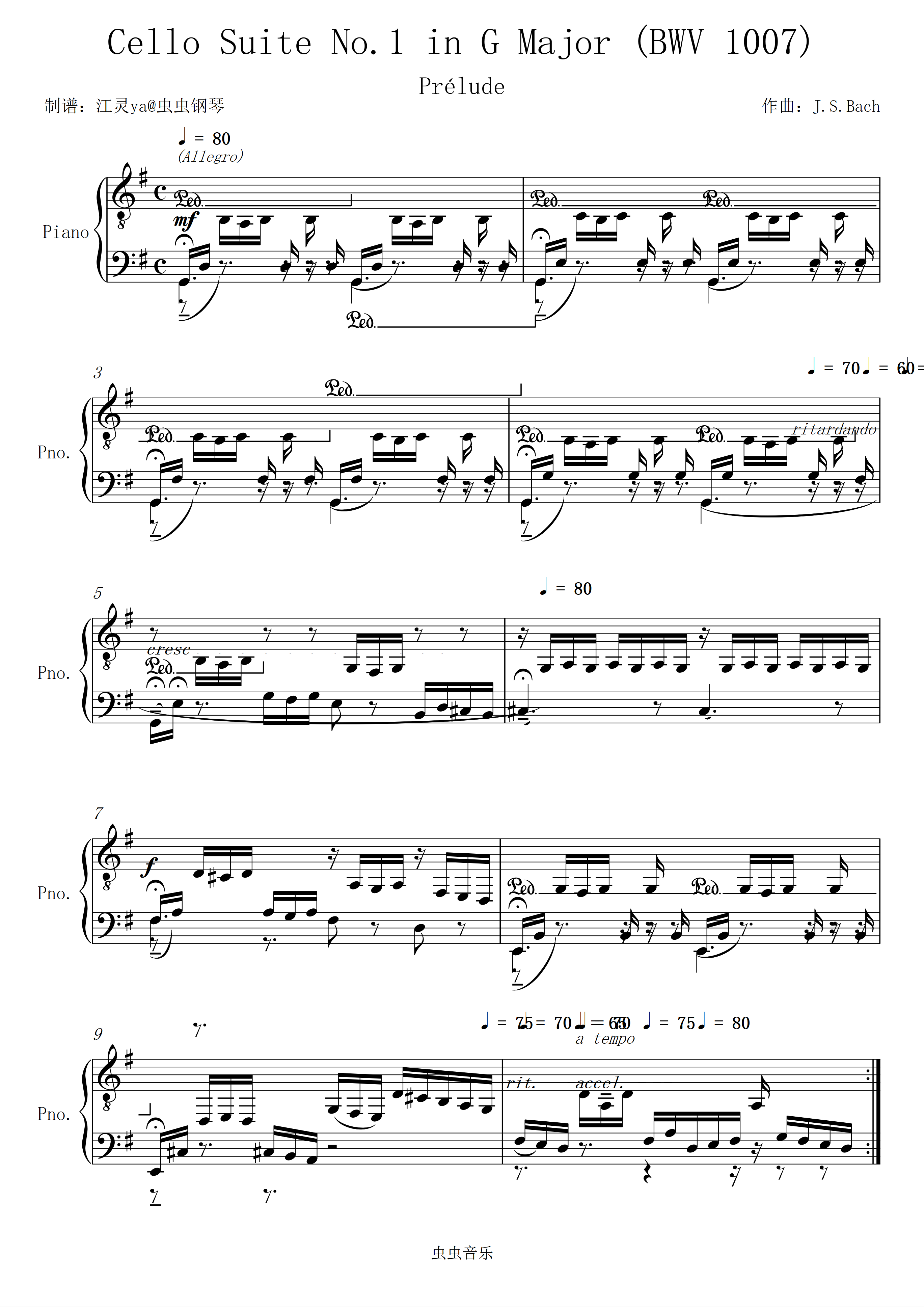 钢琴谱:Cello Suite No.1 in G Major (BWV 1007)