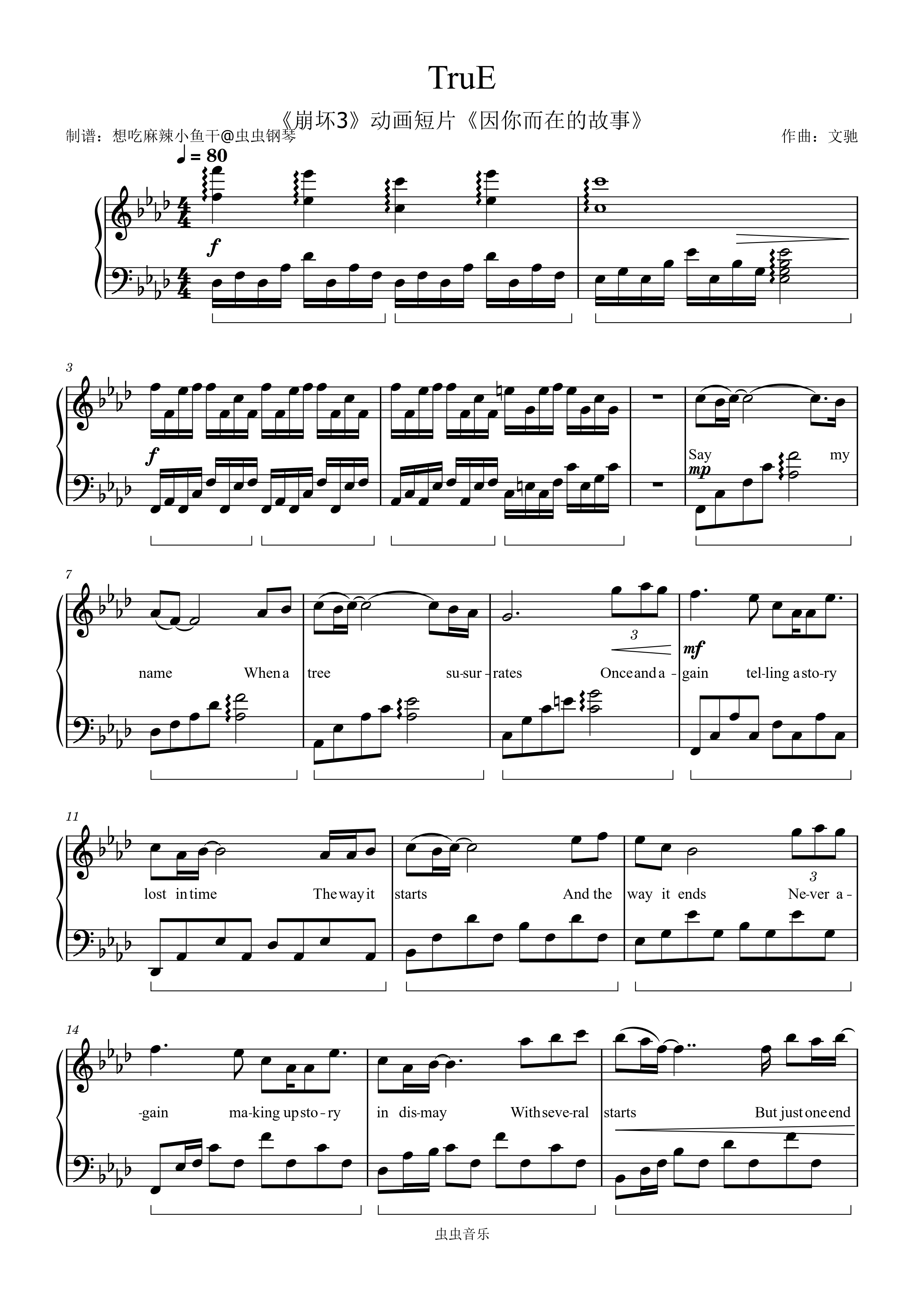 钢琴谱:TruE(《崩坏3》动画短片《因你而在的故事》)