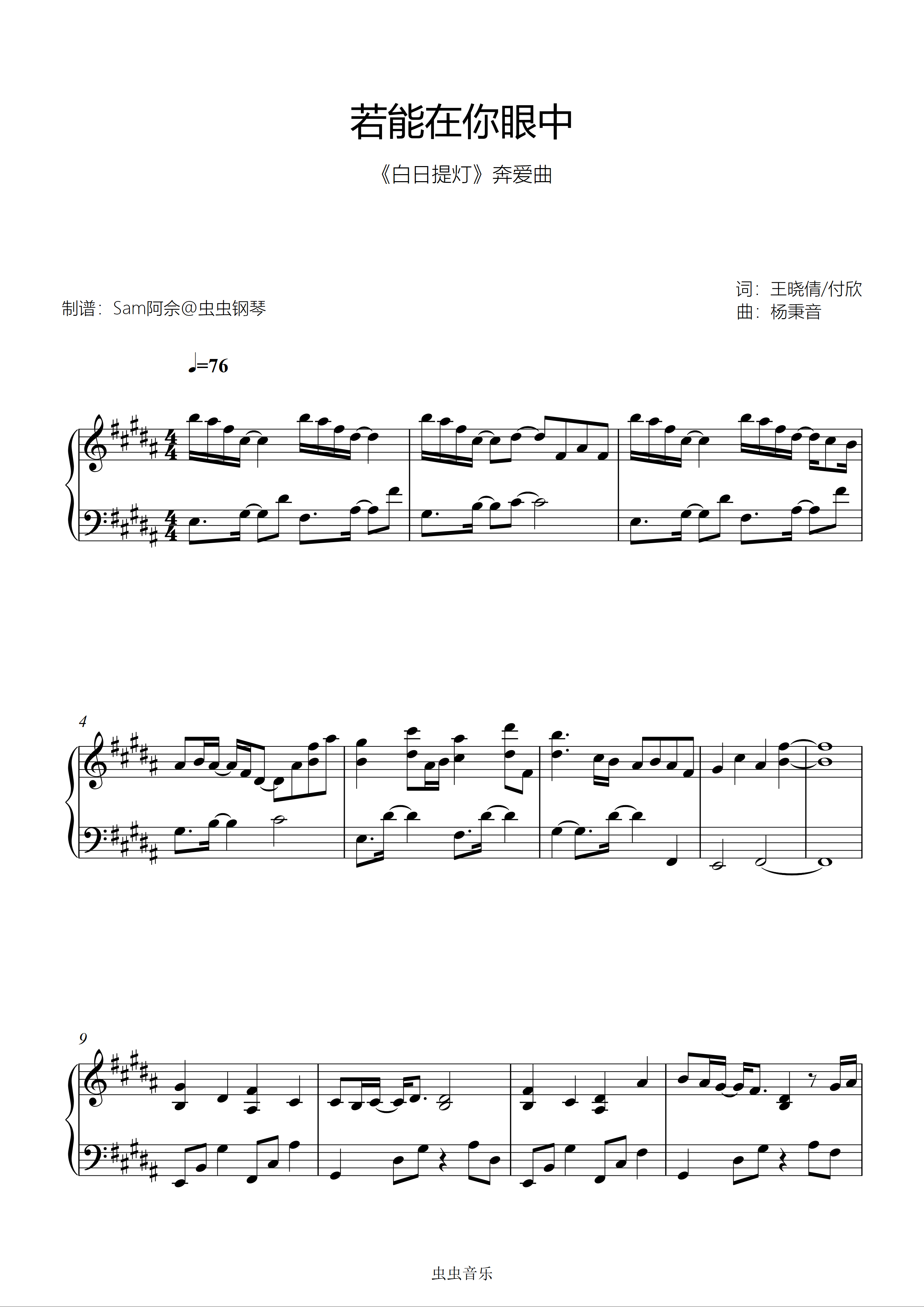 钢琴谱:原调《若能在你眼中》刘宇宁