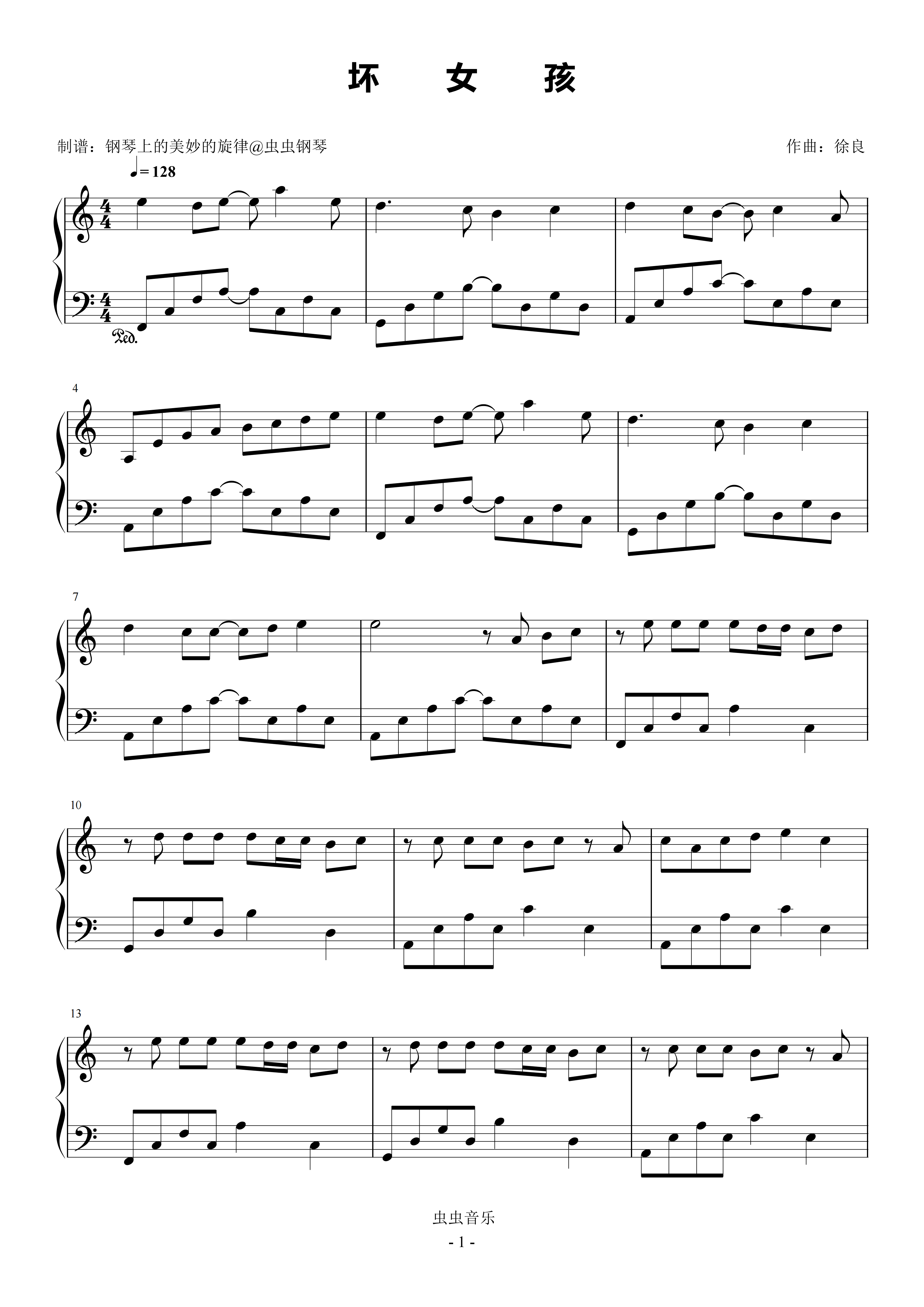 • 坏女孩钢琴简谱 F调 数字双手 徐良