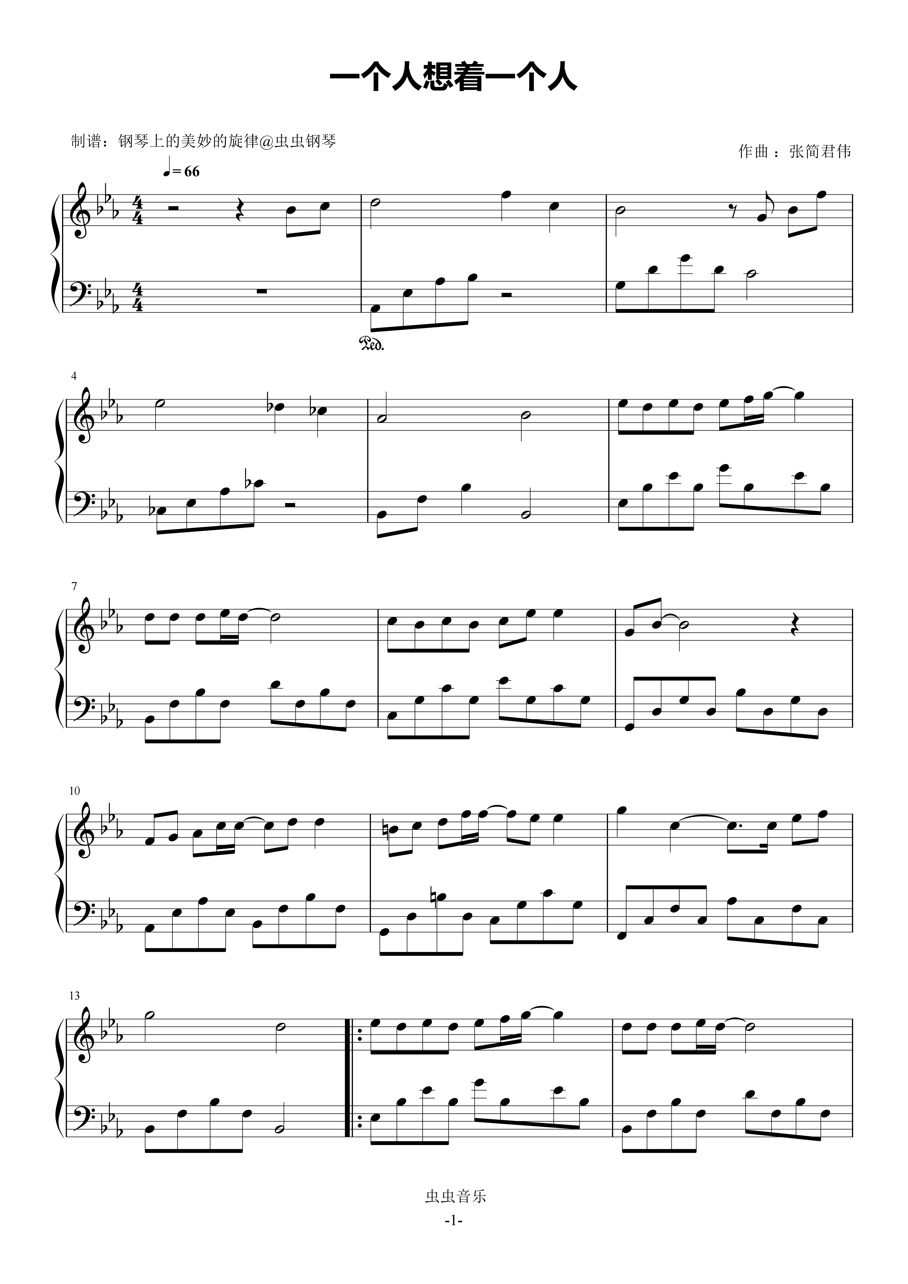 • 一个人想着一个人钢琴简谱 F调 数字双手 张简君伟