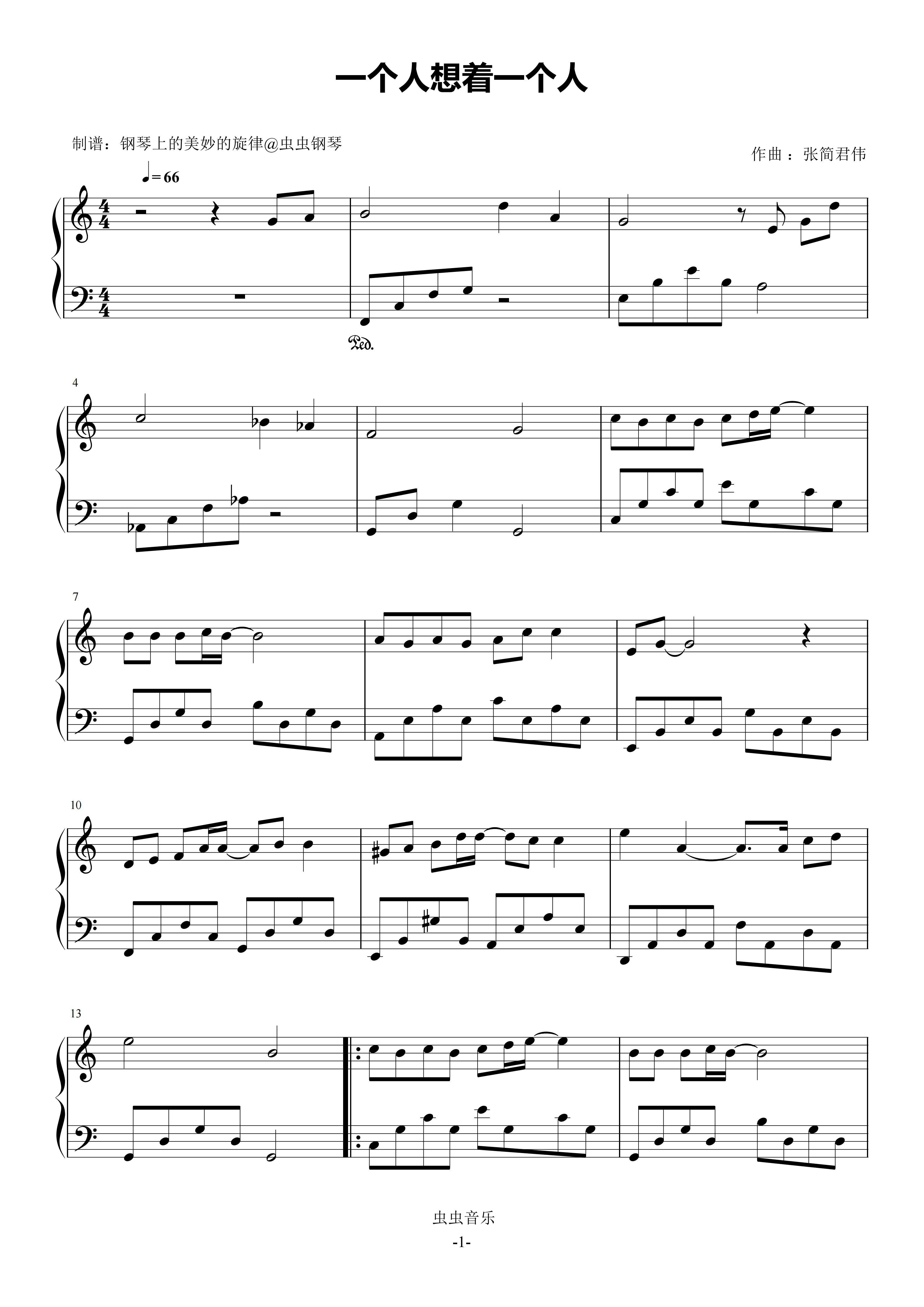 • 一个人想着一个人钢琴简谱 F调 数字双手 张简君伟