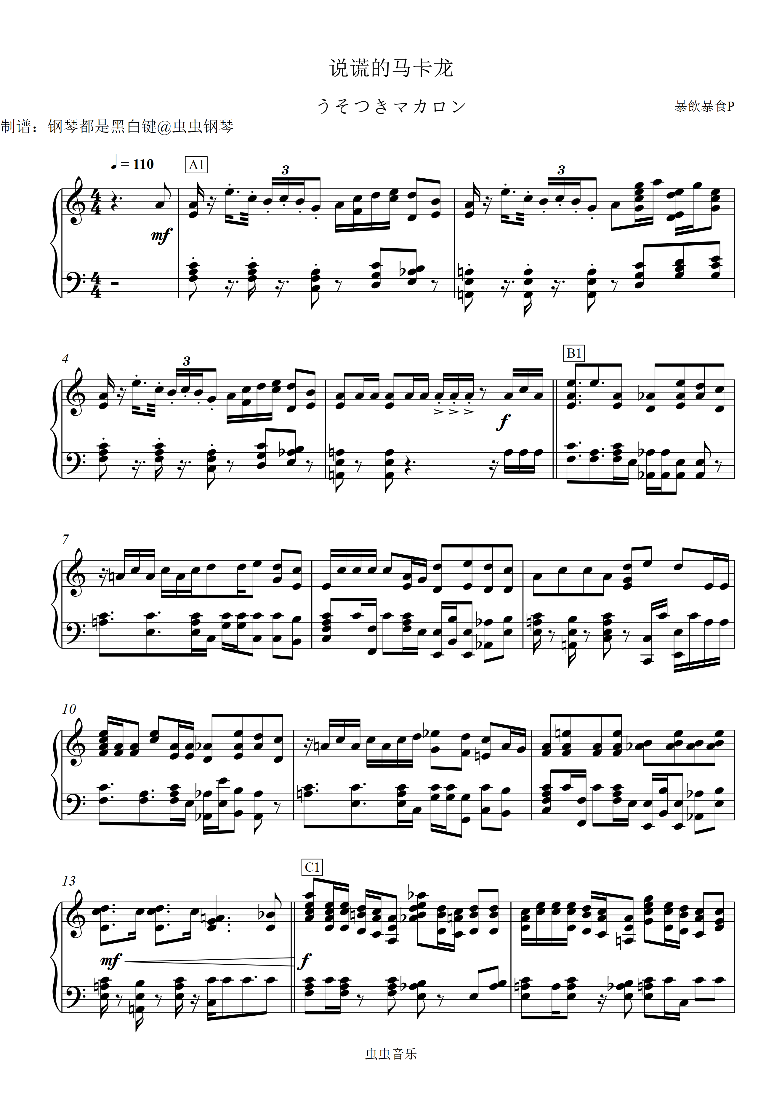 钢琴谱:(重音テト) 说谎的马卡龙(C调演奏版)