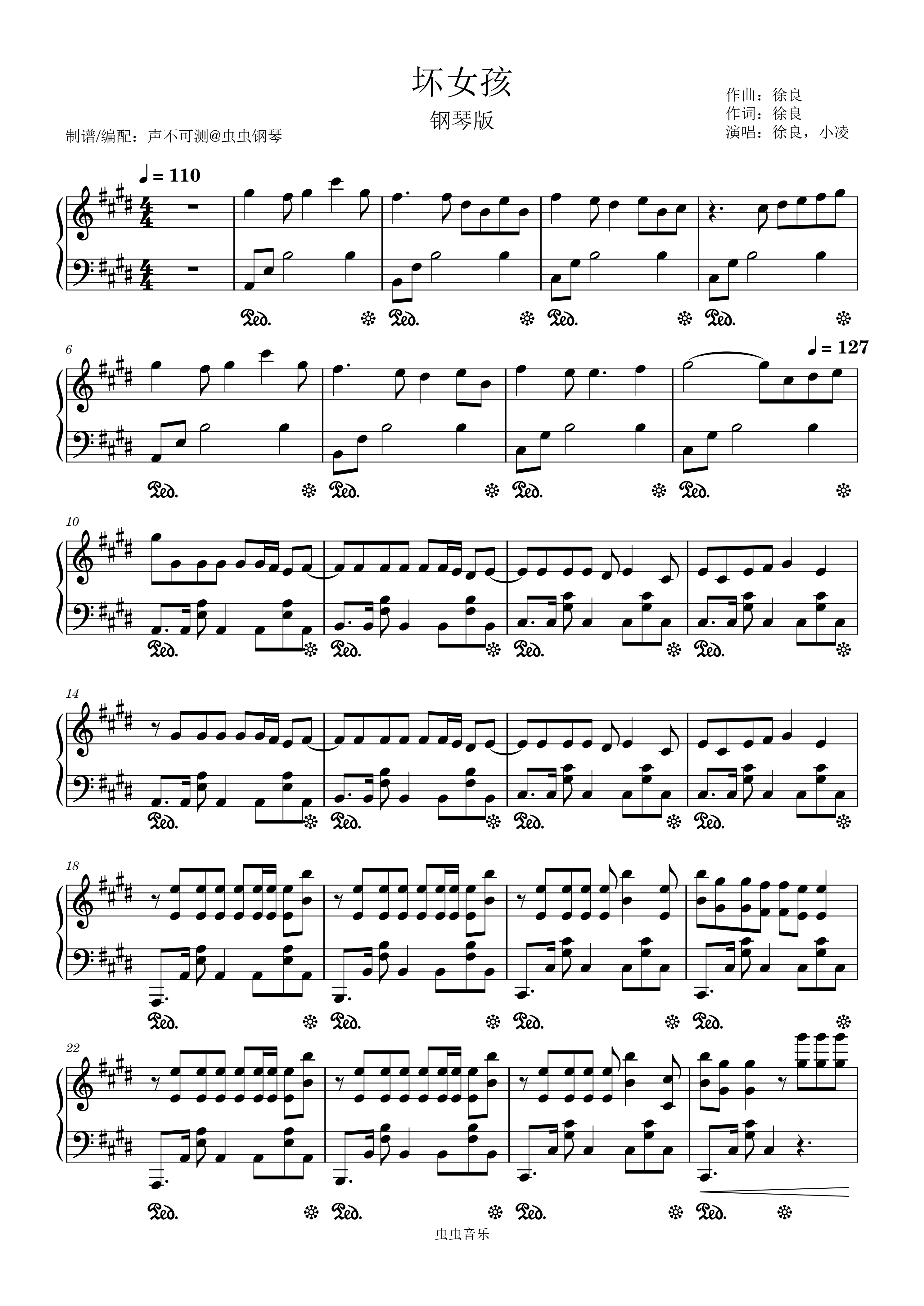 • 坏女孩钢琴简谱 E调 数字双手 徐良