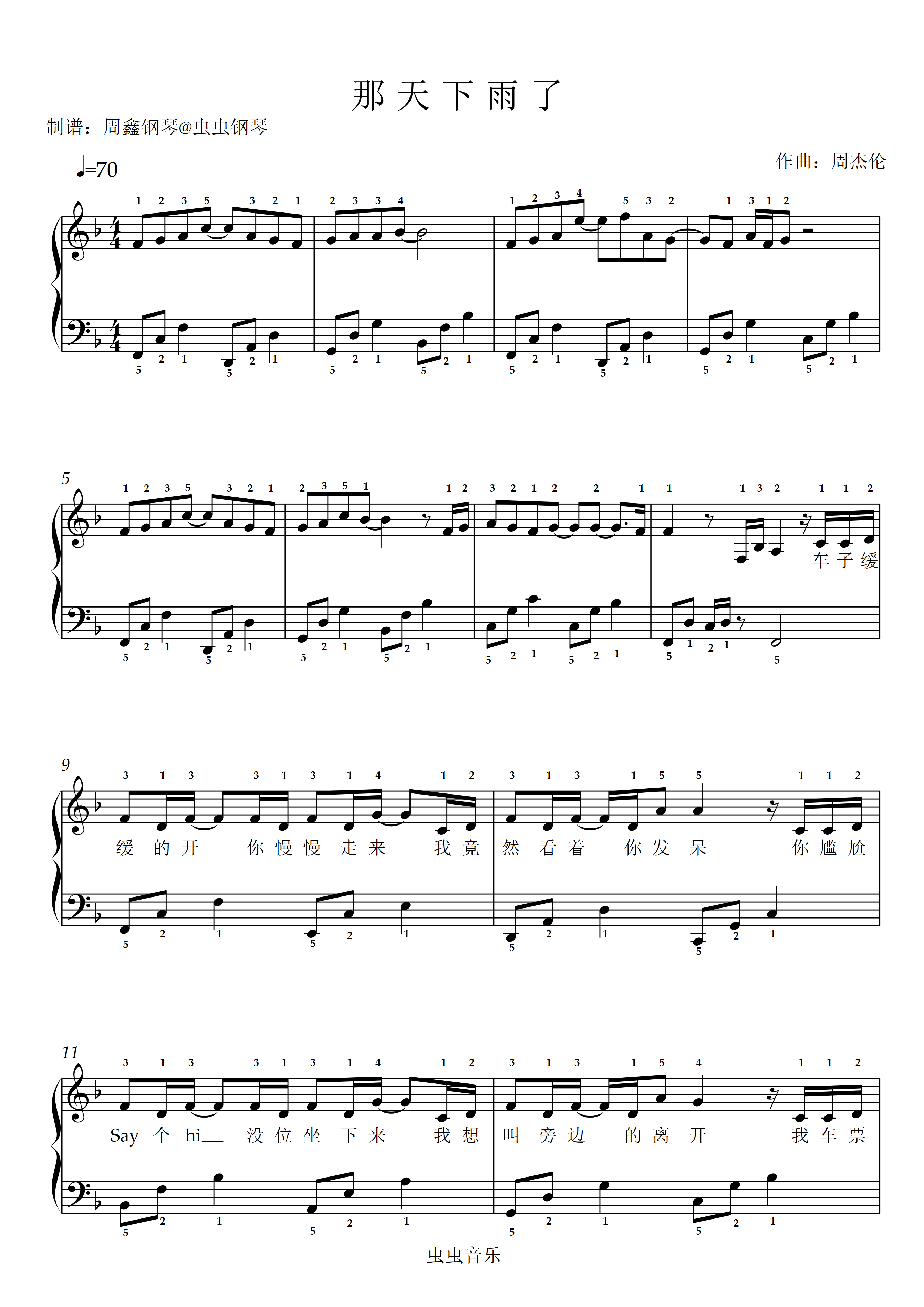 钢琴谱:《那天下雨了》F调 带歌词 带指法 简单版
