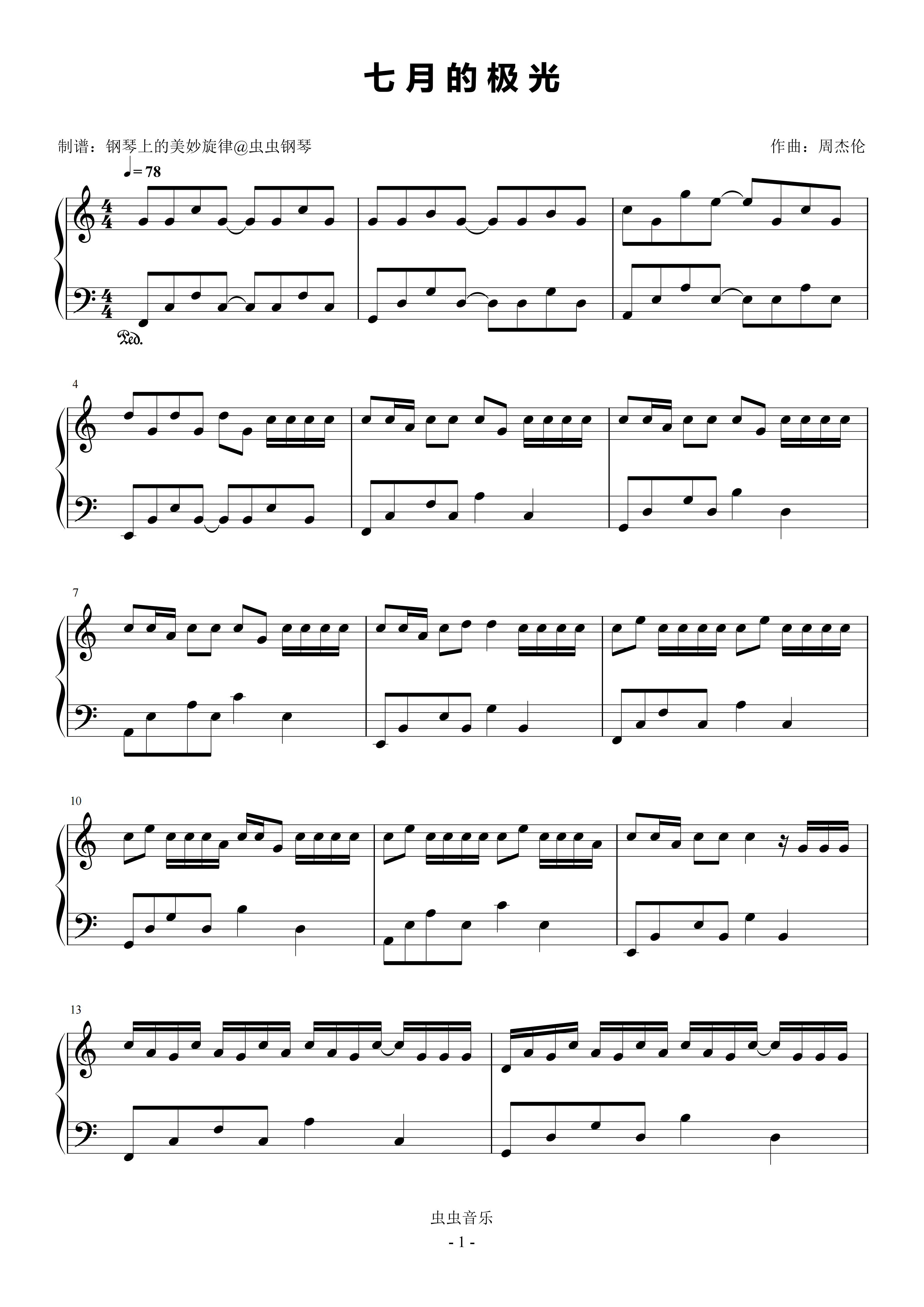 钢琴谱:七月的极光 C调简易版 周杰伦