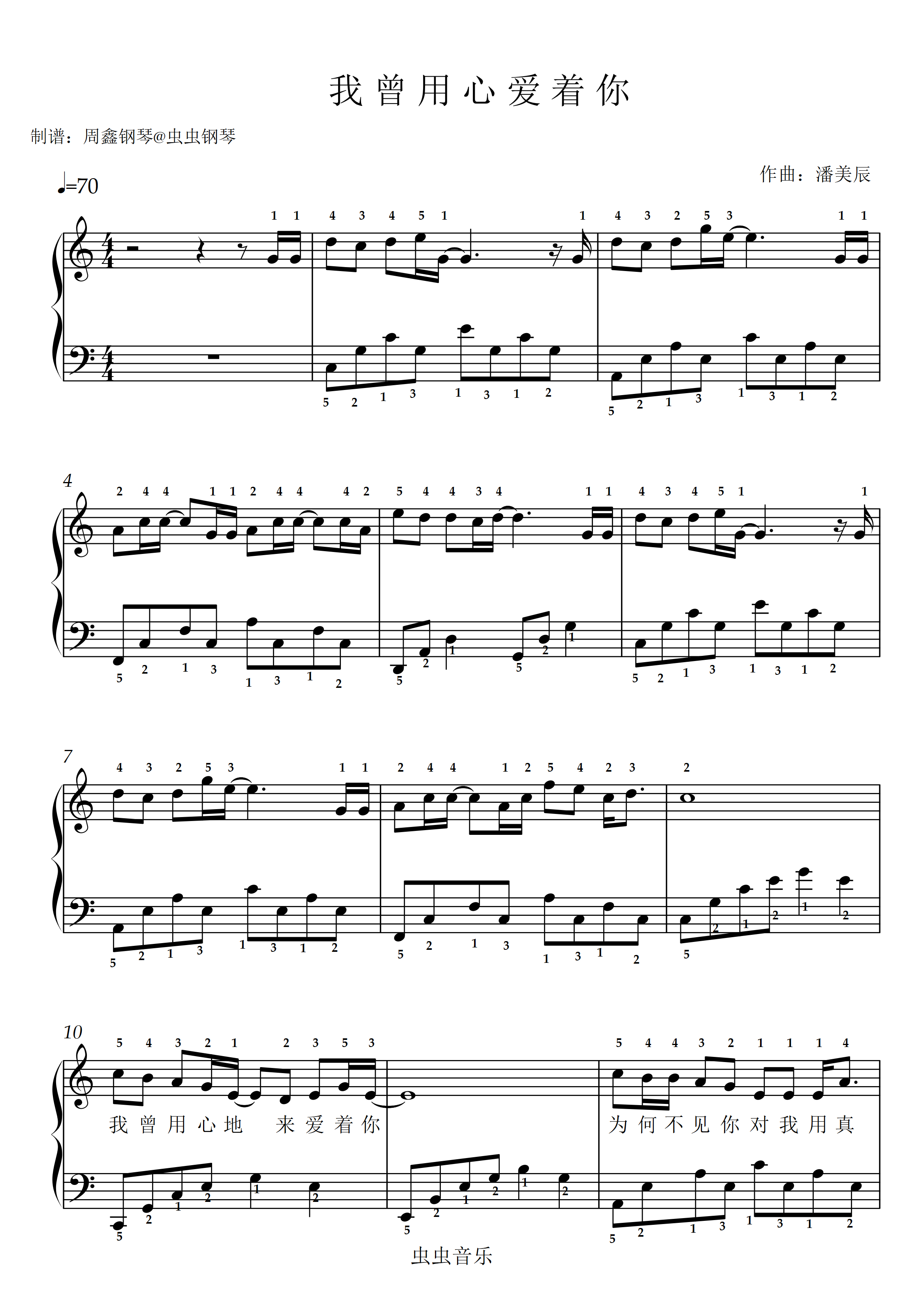 钢琴谱:《我曾用心爱着你》C调 带指法 带歌词 简单版