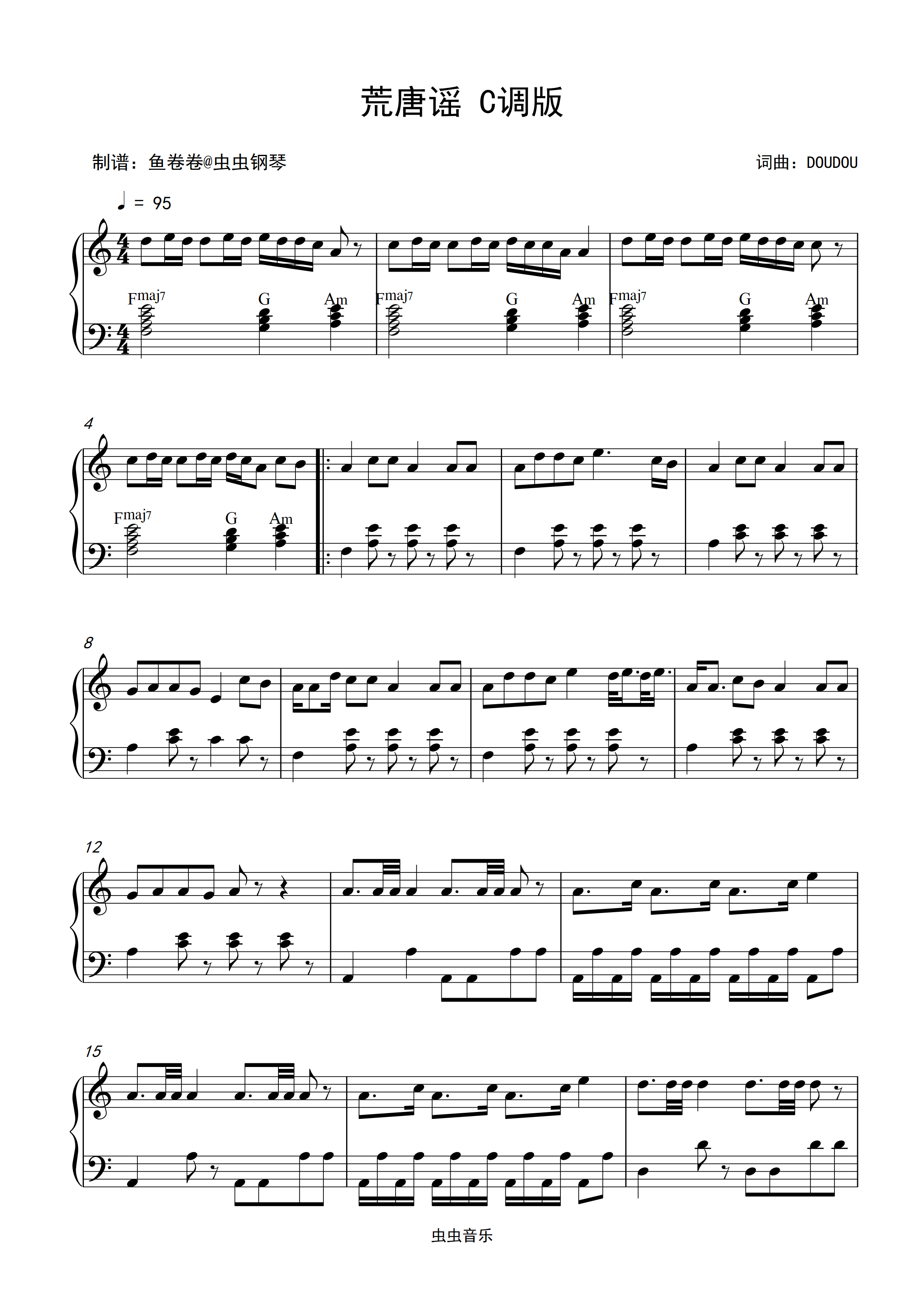 钢琴谱:荒唐谣-DOUDOU C调钢琴谱 电影《燃比娃》宣传曲