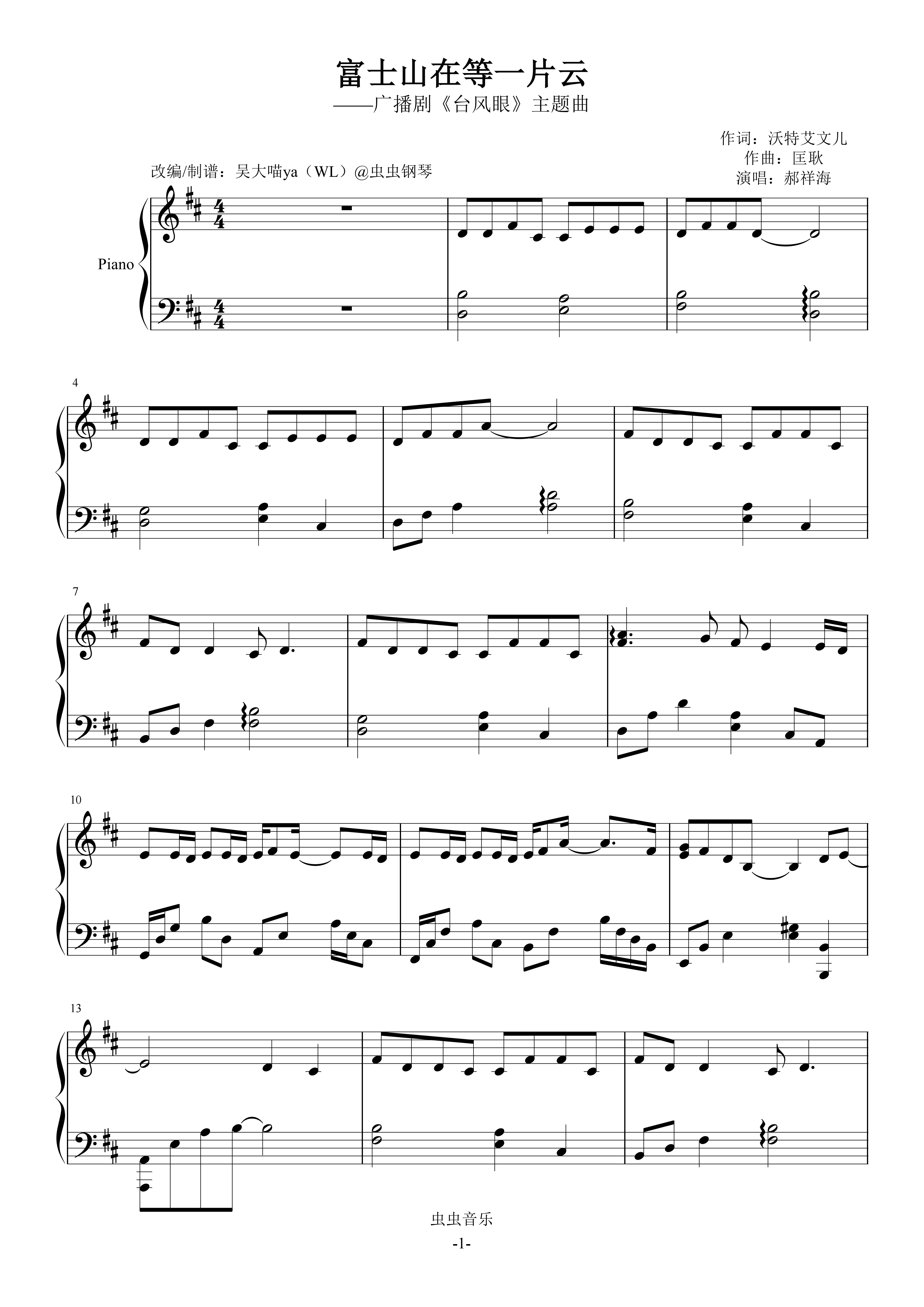 钢琴谱:富士山在等一片云-广播剧《台风眼》主题曲 原调
