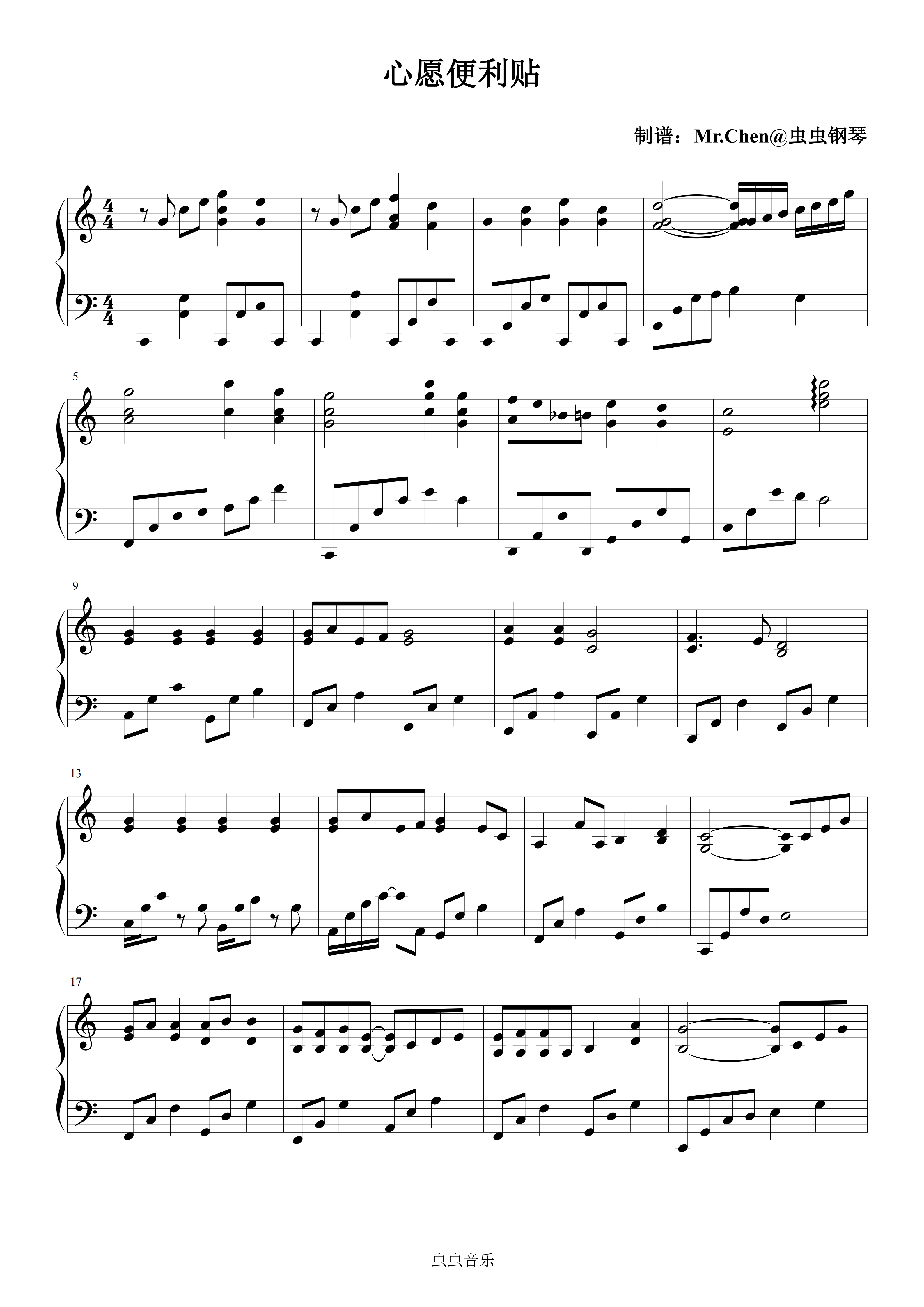 • 心愿便利贴钢琴简谱 C调 数字双手 陈静楠