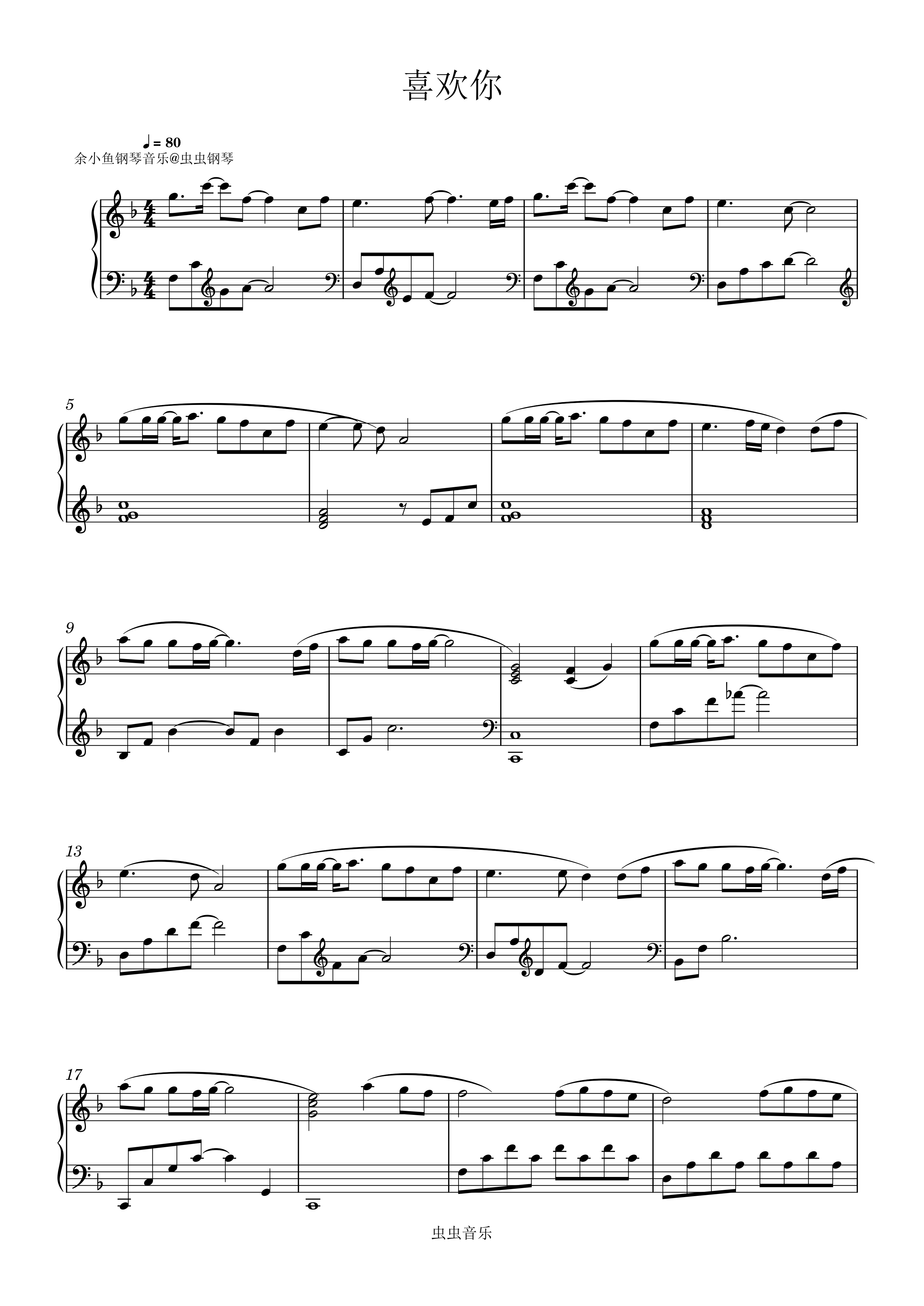 • 喜欢你钢琴简谱 F调 数字双手 黄家驹