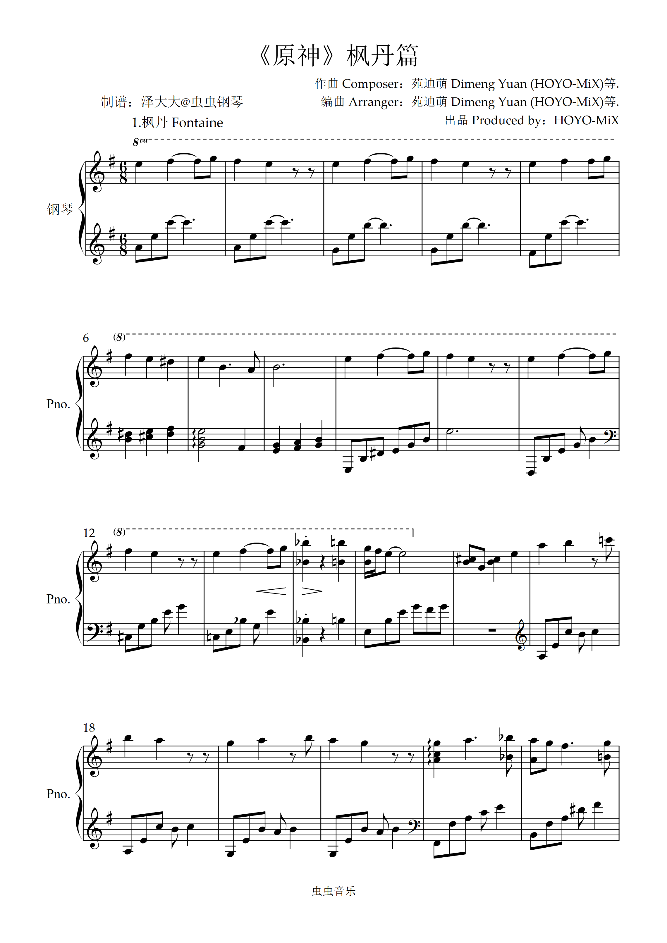 • 枫丹钢琴简谱 e调 数字双手