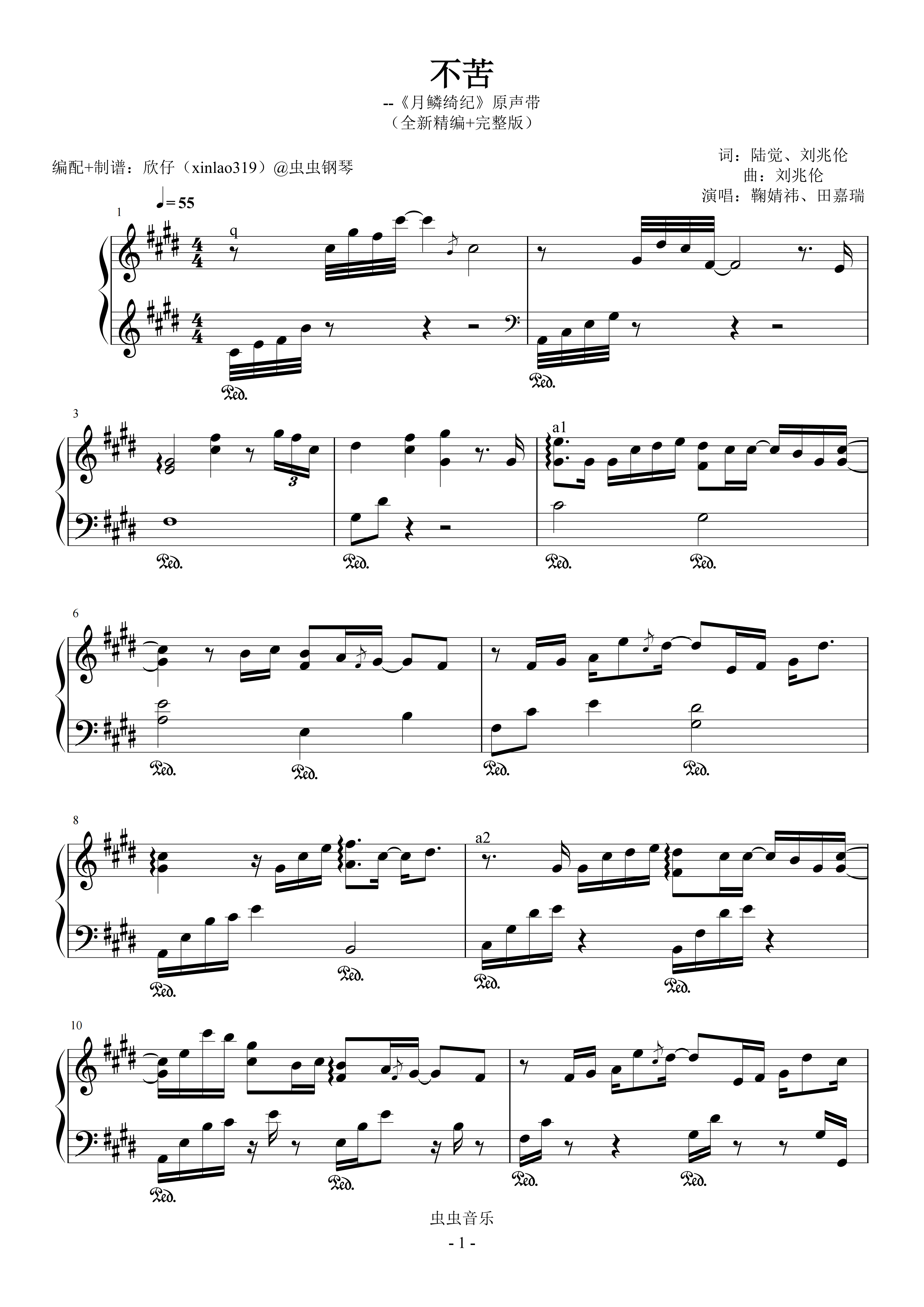钢琴谱:不苦(原调E、鞠婧祎《月鳞绮纪》原声带、全新精编+完整版)