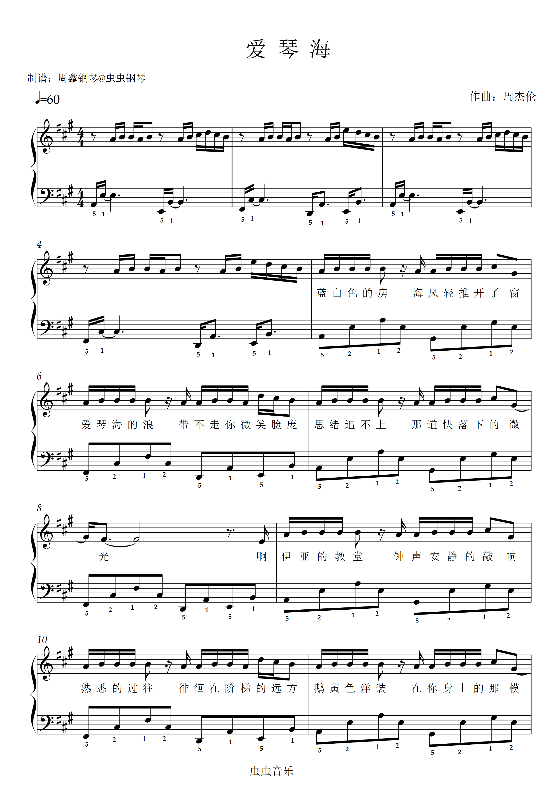 钢琴谱:《爱琴海》周杰伦 带歌词 带指法 A大调 原调