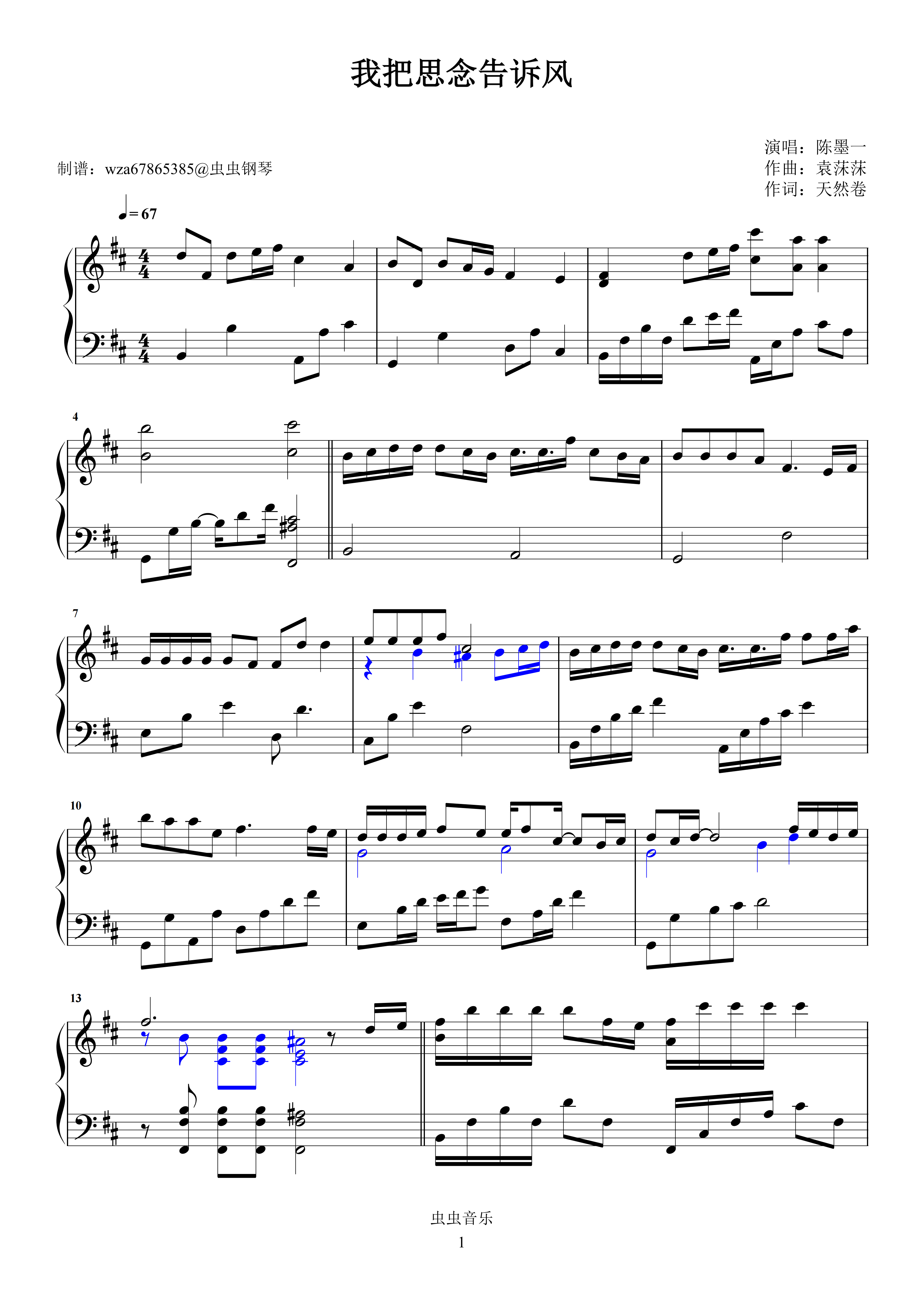 钢琴谱:我把思念告诉风