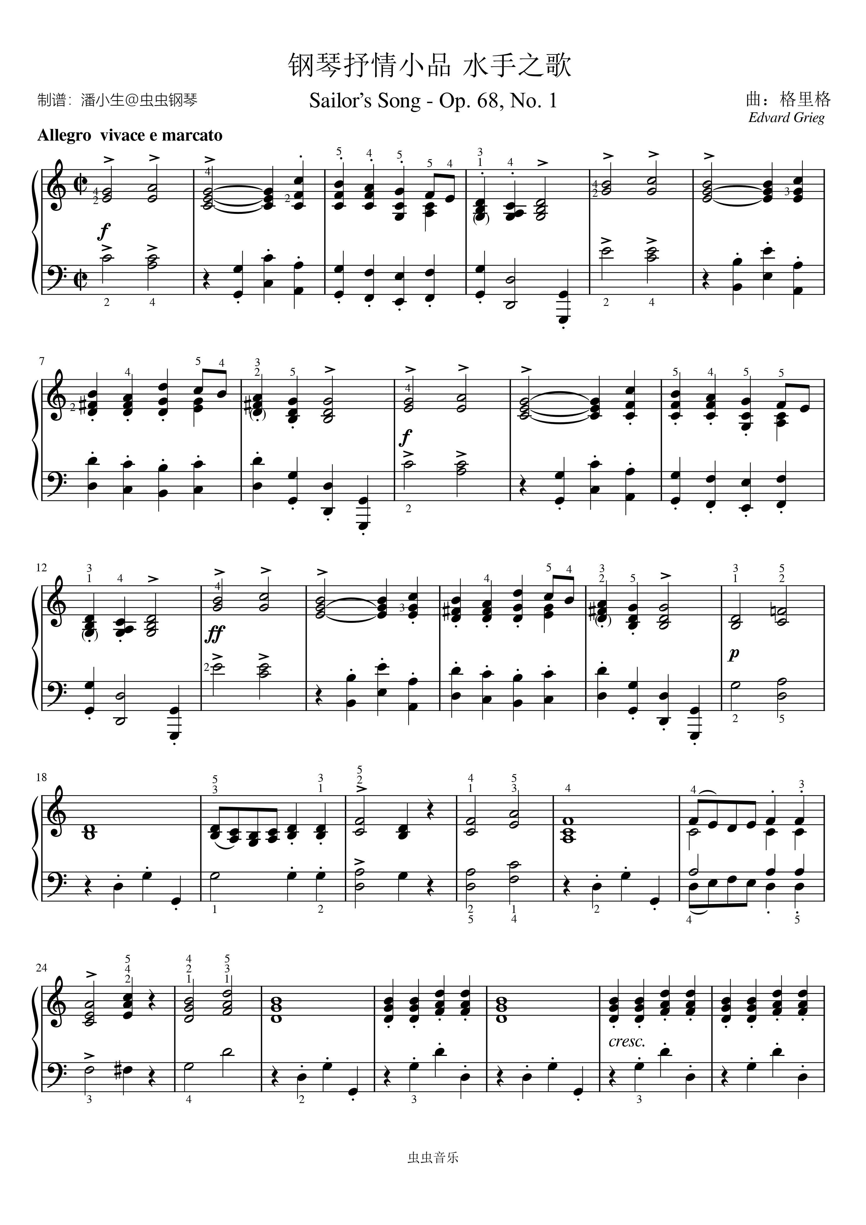 格里格 钢琴抒情小品 水手之歌 Op.68 No.1 Sailors' Song 原版带指法 钢琴独奏谱