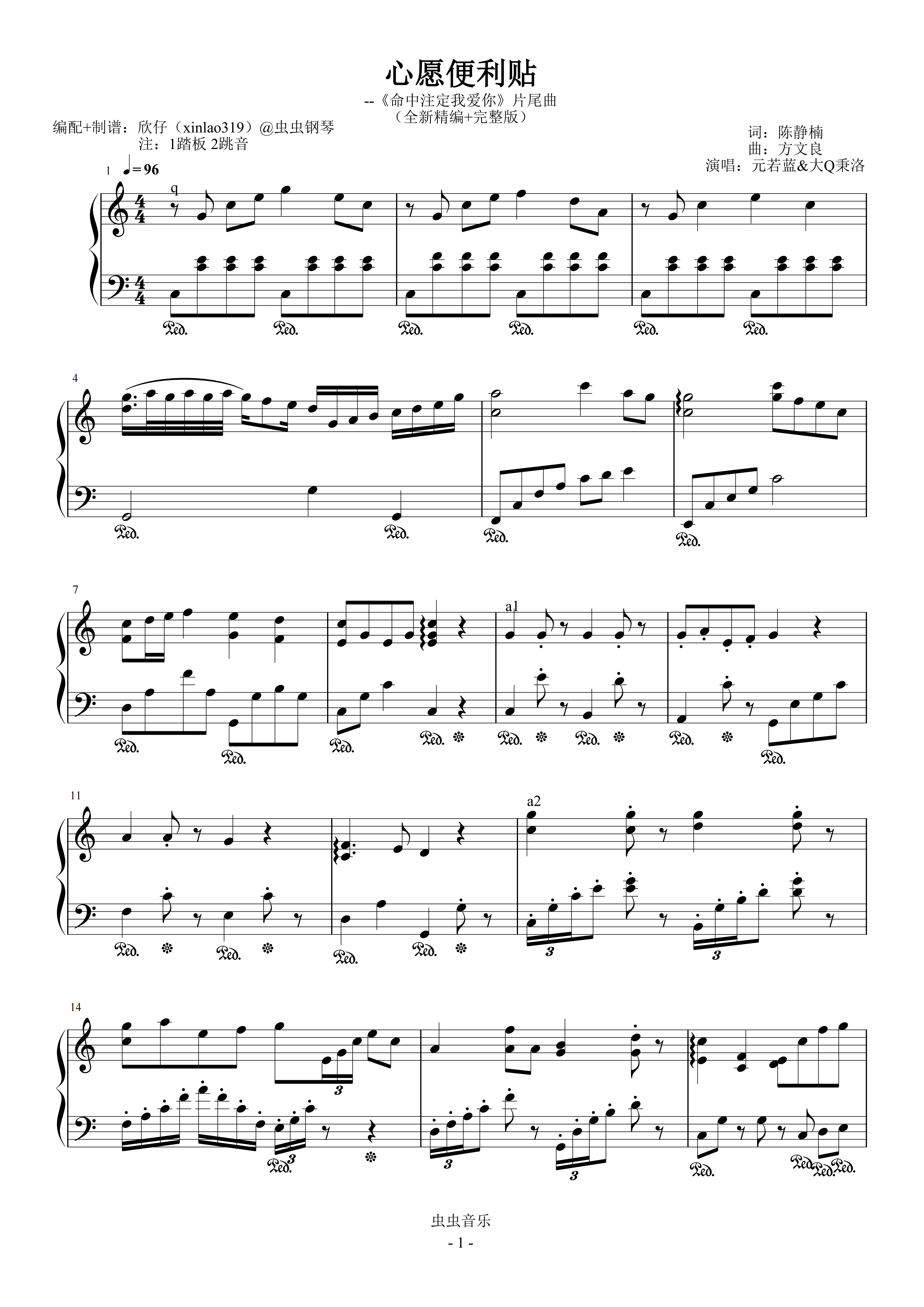 钢琴谱:心愿便利贴(C、元若蓝&大Q秉洛《命中注定我爱你》原声带、全新精编+完整版)