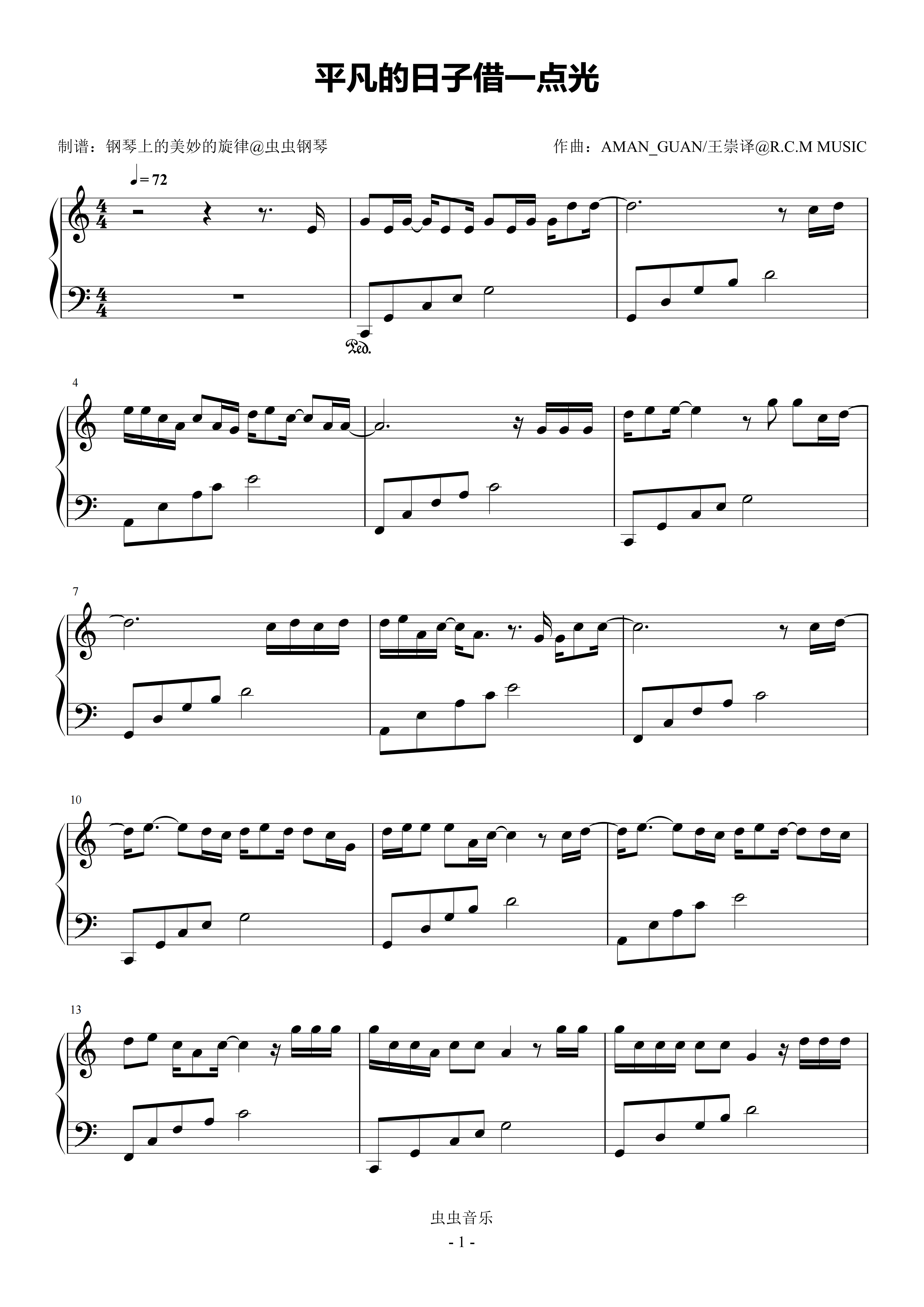 钢琴谱:平凡的日子借一点光 C调简易版 刘宇宁