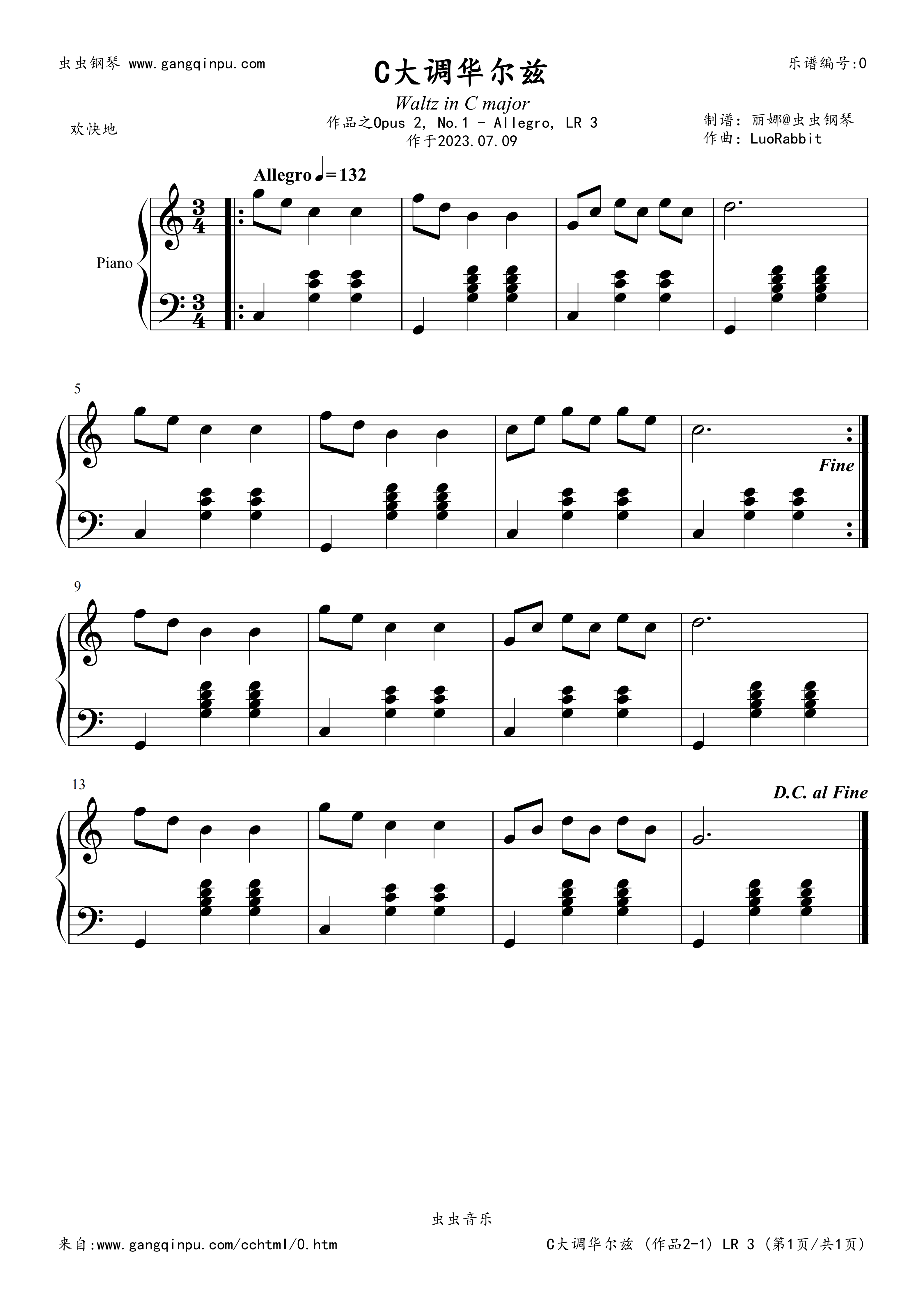 摘录自“罗兔兔”的专辑《Waltz in C major, Opus 2》第一首,Waltz in C major, Opus 2, No. 1 -, LR 3 (C大调华尔兹,作品2-1,快板,LR 3),作于2023年07月09日,并于同年发行,罗兔兔原创古典音乐。 「作者介绍」   罗兔兔 (英语;日语:ロウサギ),男,2004年10月10日出生于上海市奉贤区。   2021年02月28日,罗兔兔在《上海音乐学院》社会艺术水平的考级为:音乐基础知识B级,并取得了良好的成绩。   爱好钢琴和绘画,钢琴代表作有《阳光的一天》和《C大调华尔兹》等,绘画原创形象为“小宝兔”的二次元虚拟角色。