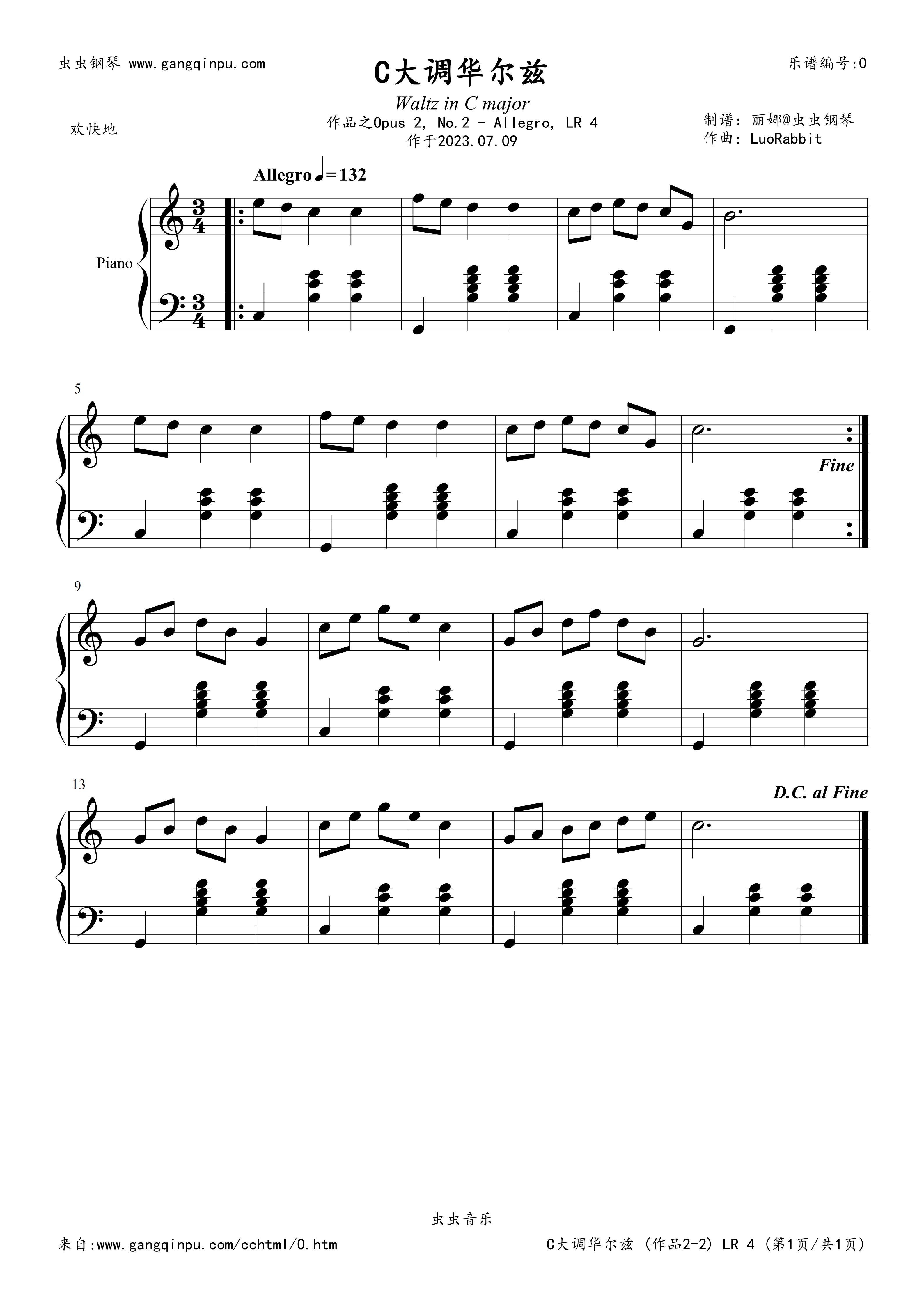 摘录自“罗兔兔”的专辑《Waltz in C major, Opus 2》第二首,Waltz in C major, Opus 2, No. 2 -, LR 4 (C大调华尔兹,作品2-2,快板,LR 4),作于2023年07月09日,并于同年发行,罗兔兔原创古典音乐。 「作者介绍」   罗兔兔 (英语;日语:ロウサギ),男,2004年10月10日出生于上海市奉贤区。   2021年02月28日,罗兔兔在《上海音乐学院》社会艺术水平的考级为:音乐基础知识B级,并取得了良好的成绩。   爱好钢琴和绘画,钢琴代表作有《阳光的一天》和《C大调华尔兹》等,绘画原创形象为“小宝兔”的二次元虚拟角色。