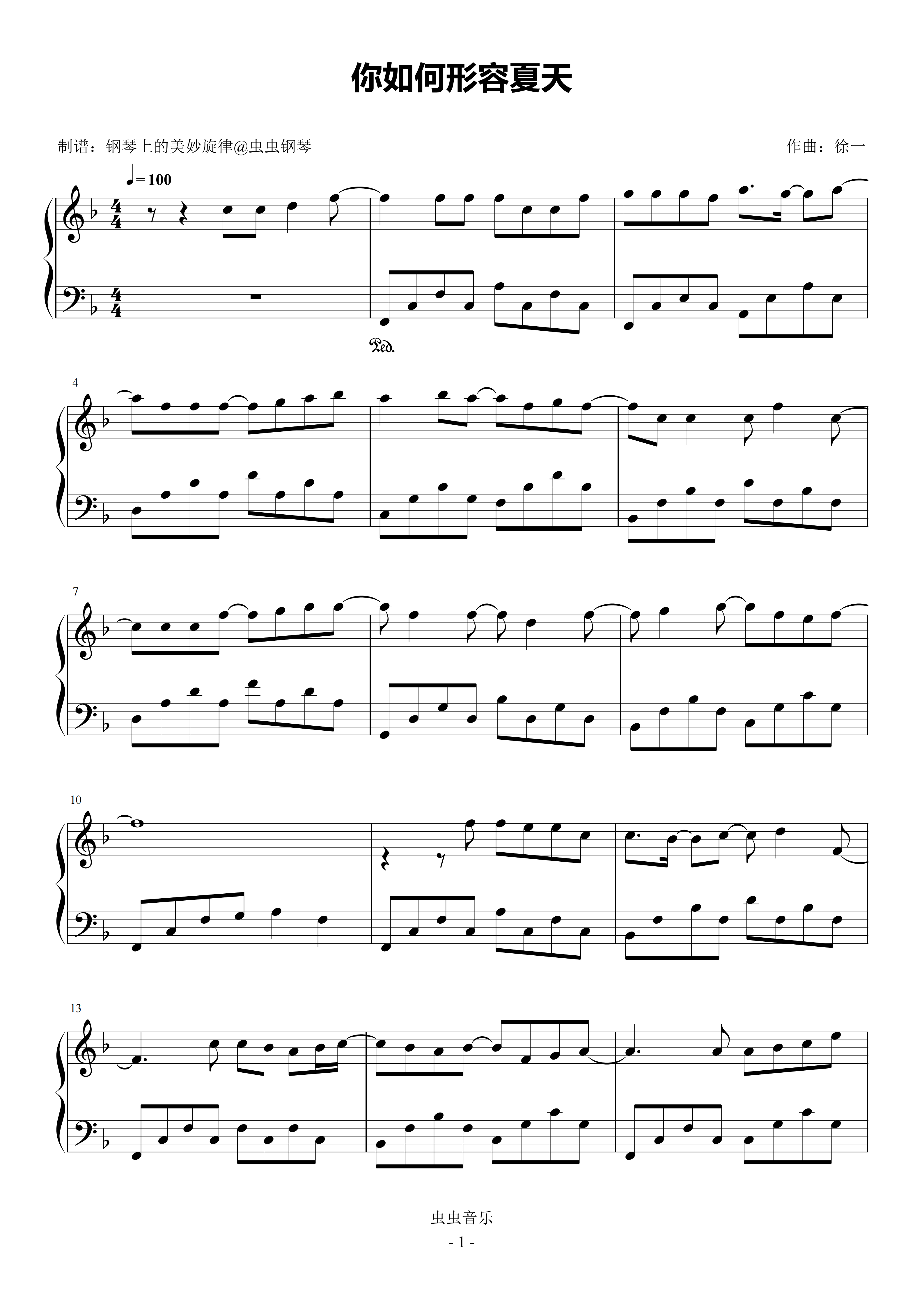 钢琴谱:你如何形容夏天 原调简易版 醉雪 百万UP学神天天演我