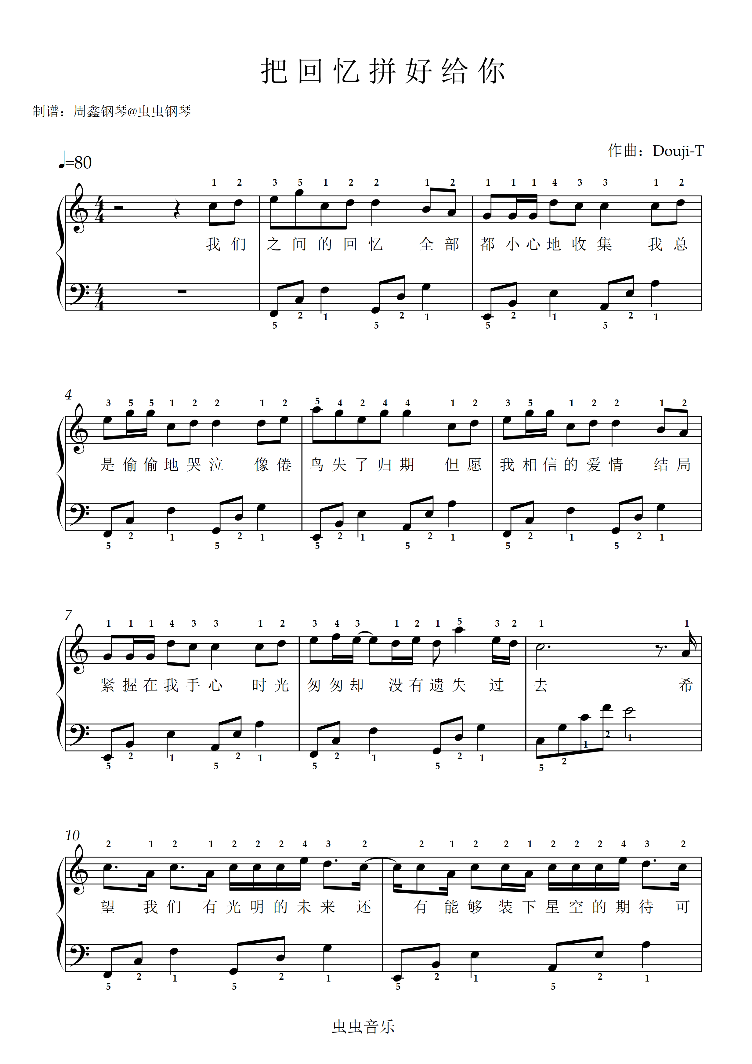 钢琴谱:《把回忆拼好给你》C调 带歌词 带指法 简单版