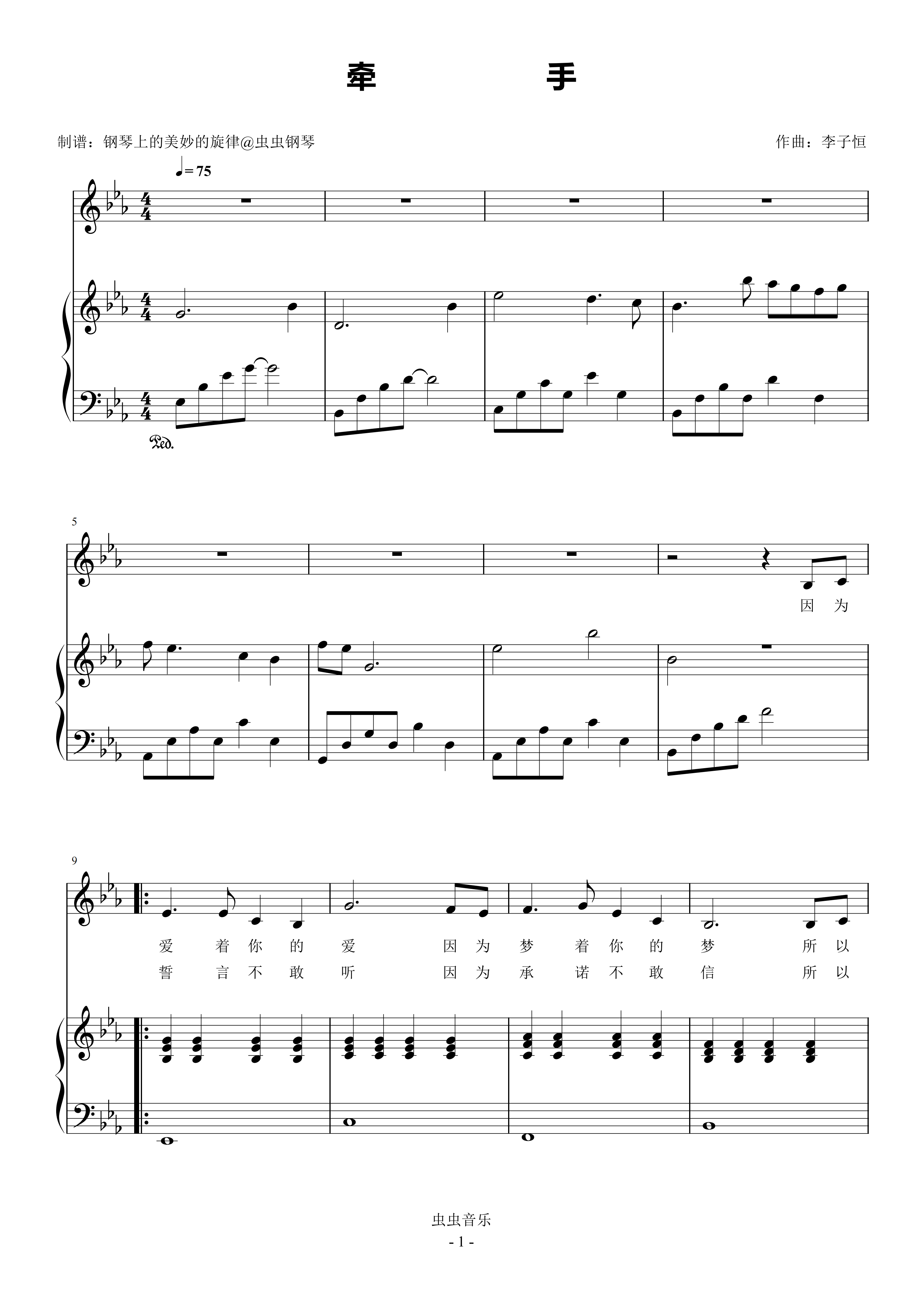 • 牵手钢琴简谱 C调 数字双手 李子恒