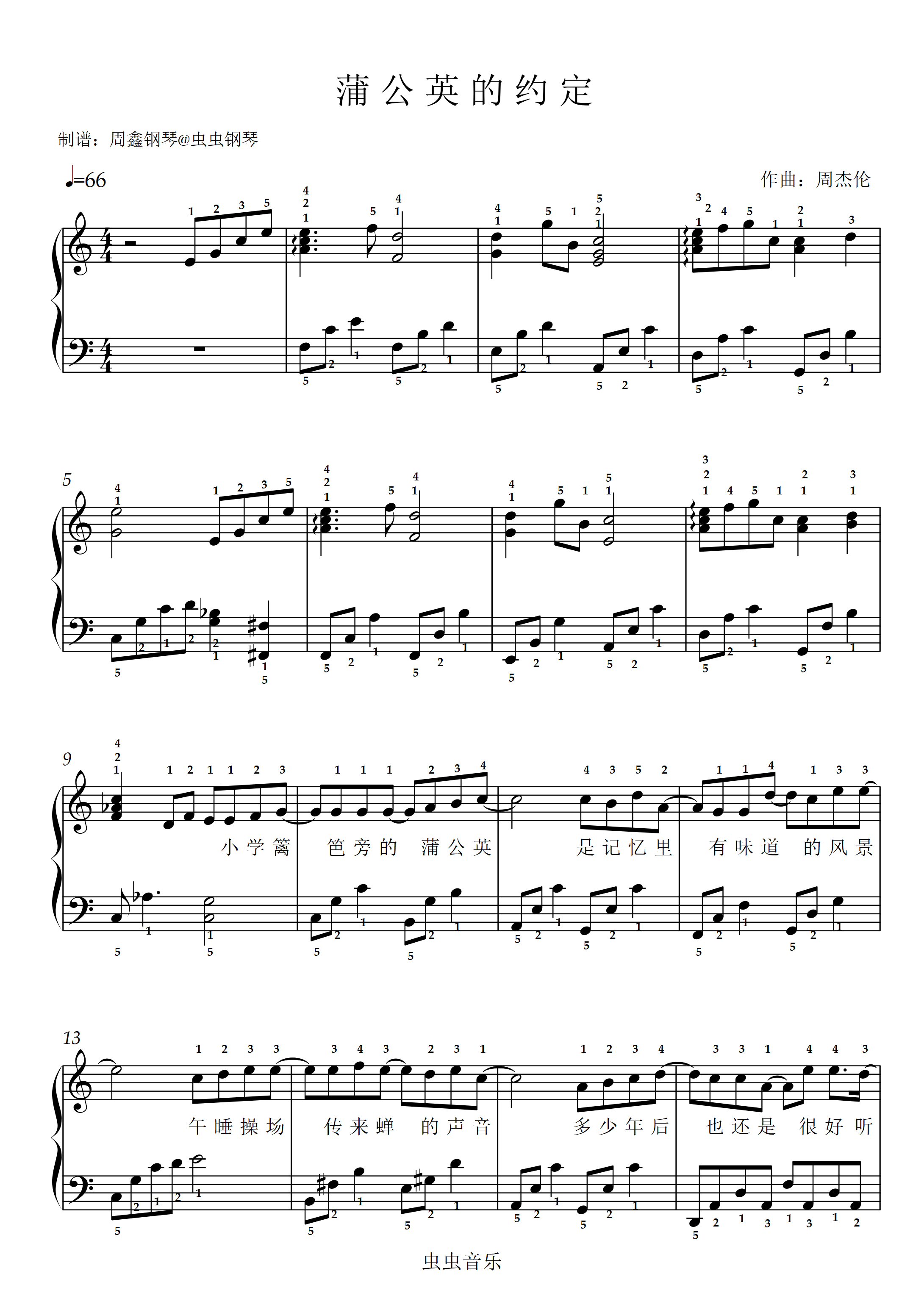 钢琴谱:《蒲公英的约定》C调 带歌词 带指法 简单版